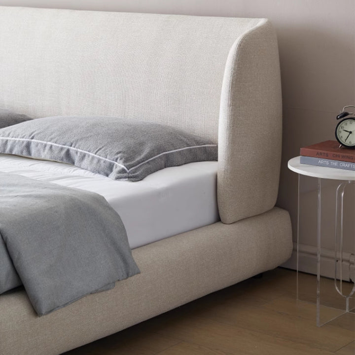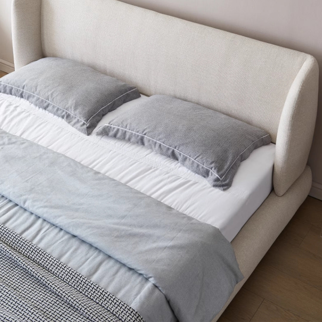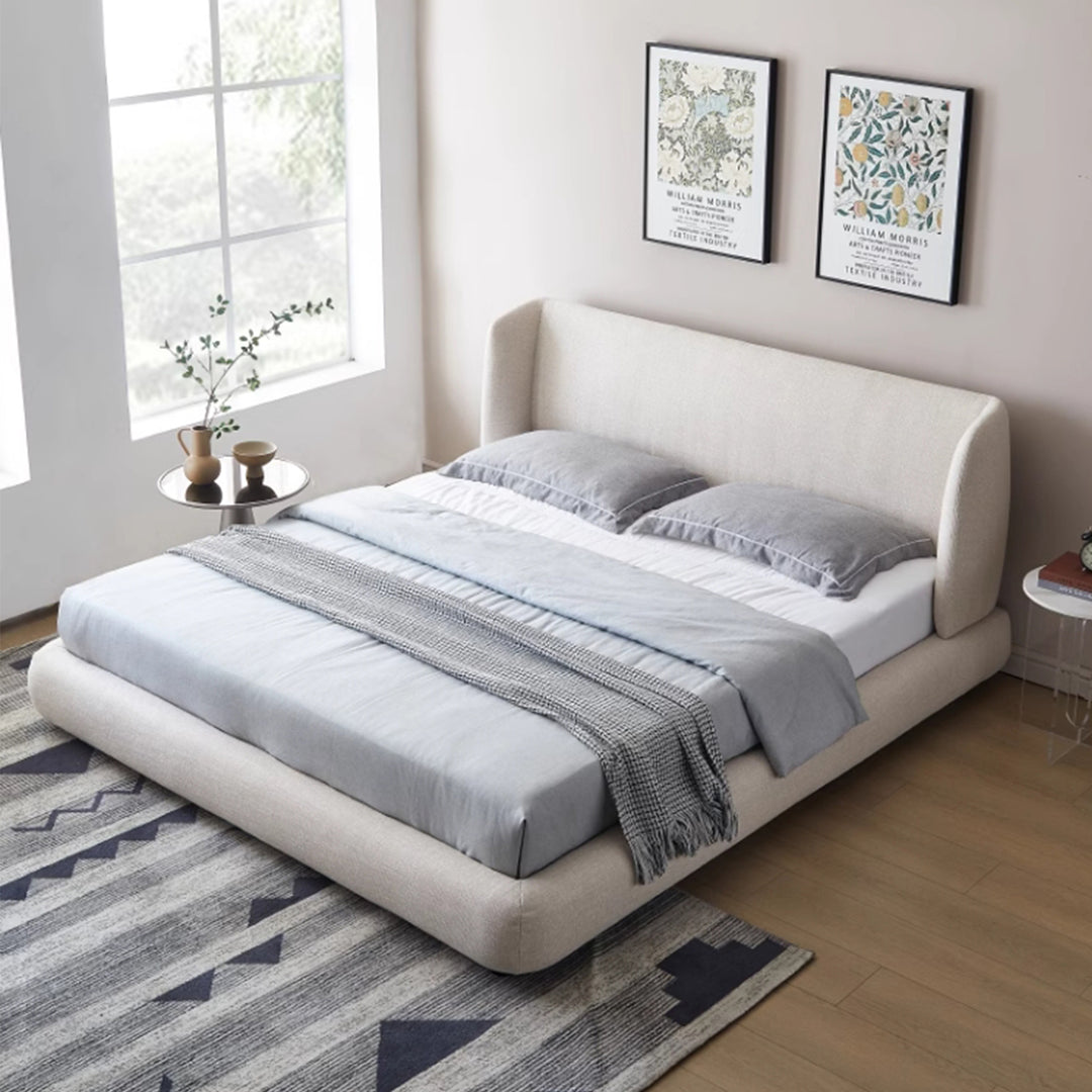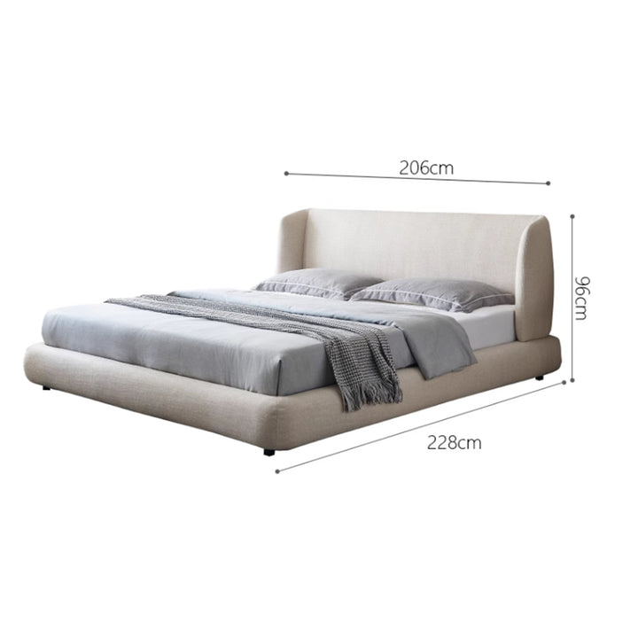 Relax in luxury with our Masdio Modern bedframe, boasting a tall, winged headboard for added comfort and security. Crafted with a robust internal structure of pine wood and supported by durable bed slats, this bedframe combines style with strength. The creamy fabric upholstery adds a timeless charm, creating a tranquil bedroom sanctuary. Pair it with our bedside table and night light to complete the cozy hygge or Japandi aesthetic.