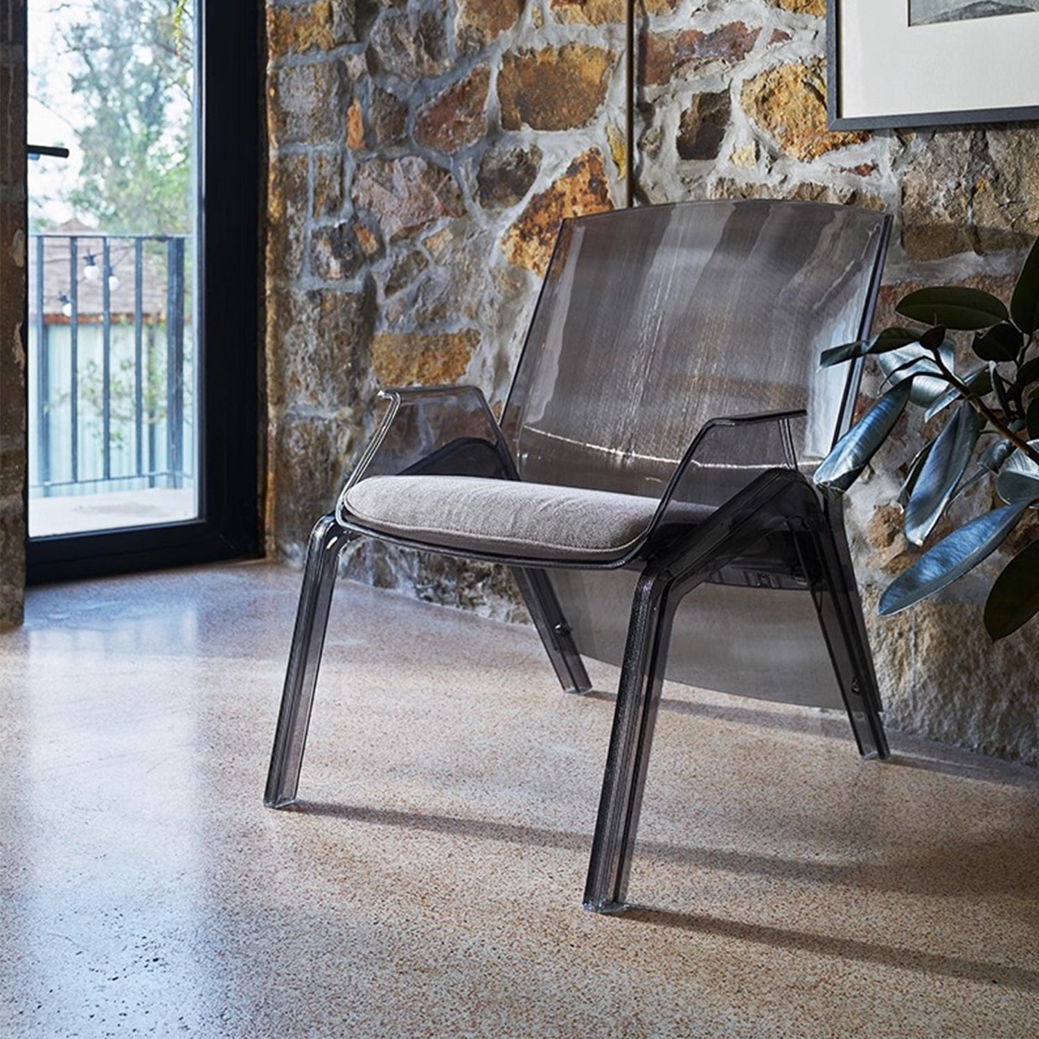 Relax in style with our DAGNY acrylic lounge chair. Its low-slung design and wide back and seat make it perfect for lounging. The fabric cushion seat adds comfort, while the acrylic frame ensures easy maintenance. Place it in your living room, patio, or poolside for a chic and modern touch. This chair's postmodern design makes it a great conversation piece, perfect for adding a touch of personality to your space.