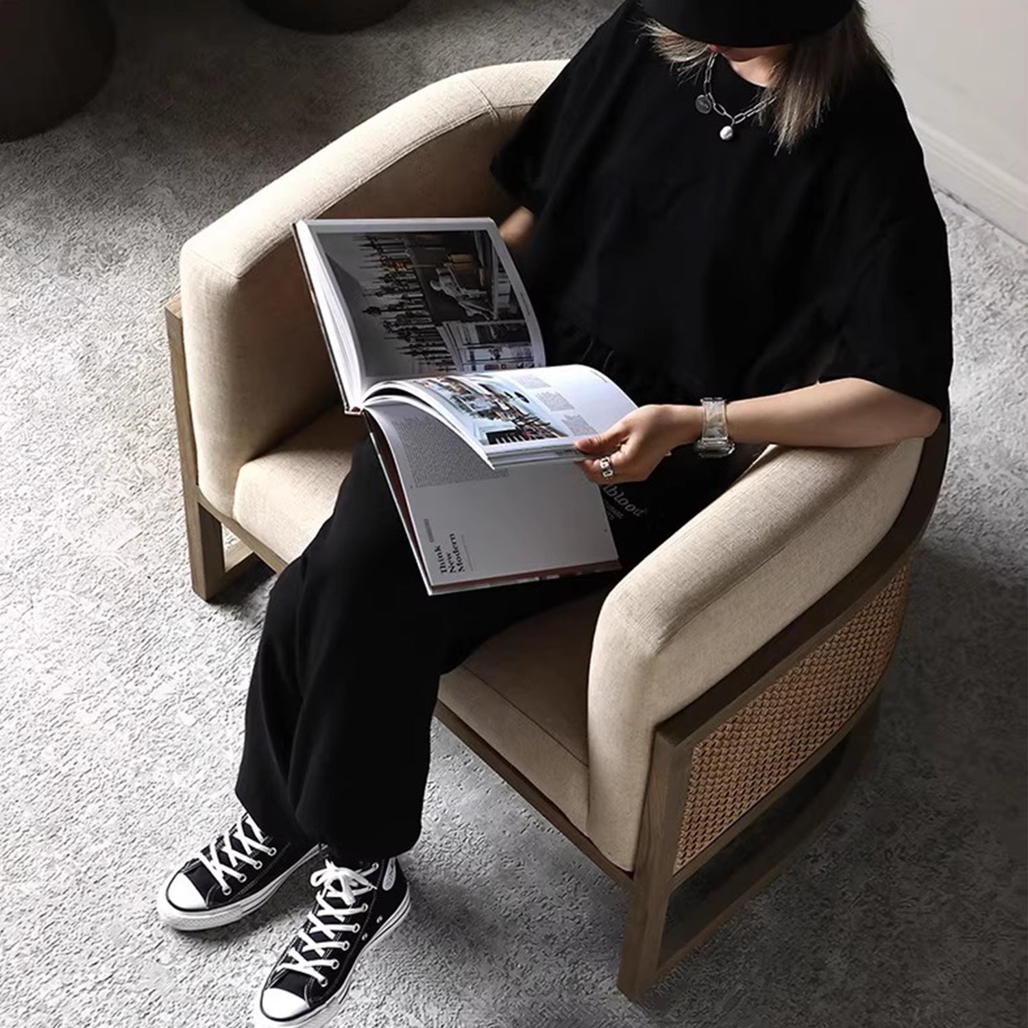 Bring warmth and character to your home with our MAIRA armchair. The curved backrest and plush high-density foam cushion seat and backrest provide exceptional comfort. The sturdy oak wood frame features rattan cladding, adding a touch of natural elegance. With its vintage, rustic charm, this reading chair is perfect for those seeking a cozy, organic look that exudes warmth and inviting charm.