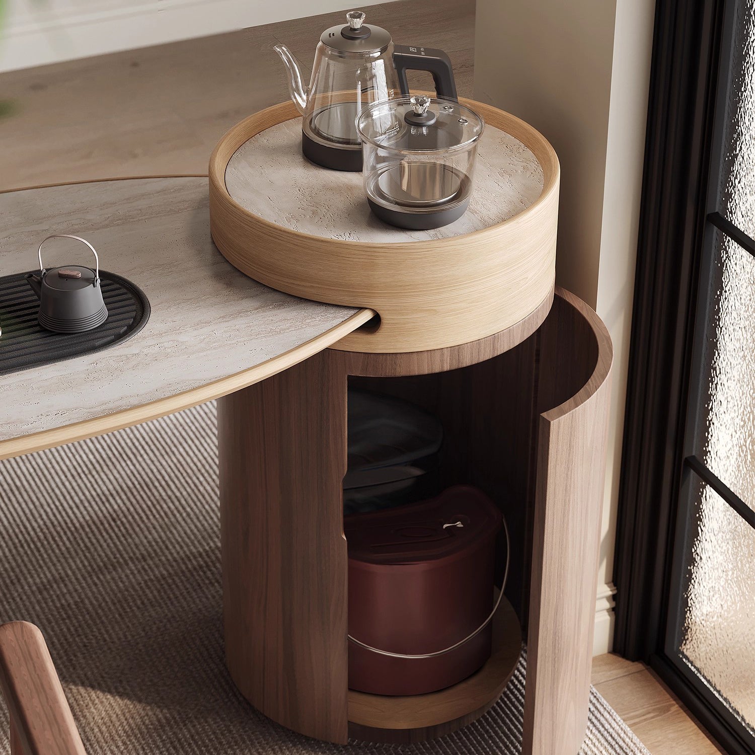 Bring Japandi style to your study space with our SHARON oval-shaped desk, featuring a sintered stone top in a beautiful travertine finish. Paired with oak legs and an integrated cabinet, this desk offers ample storage and a sleek aesthetic. The thoughtful design includes an end table extension, perfect for placing your tea or coffee, creating a cozy and inviting workspace. With its harmonious blend of natural materials and minimalist design, our study desk is ideal for those seeking a peaceful and productive environment. Enhance your study routine with this beautifully crafted and functional Japandi-inspired desk.