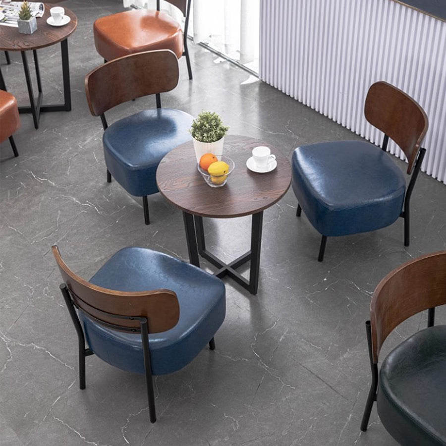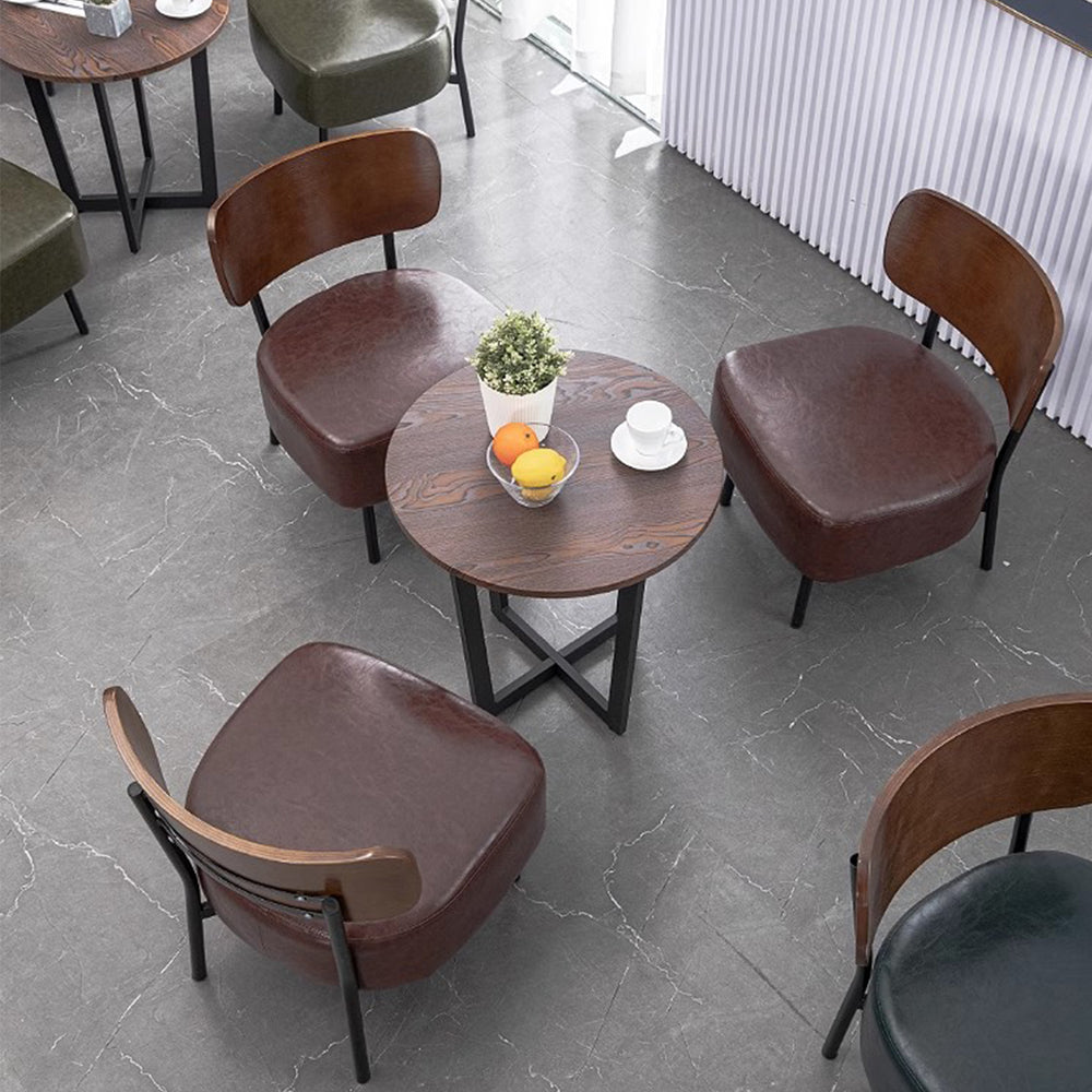 Be it an industrial chic loft or modern abode, this vintage leather and wood dining chair brings industrial appeal to your indoor or outdoor space. Faux aged leather upholstery wraps around the seat, with a curved walnut veneer backrest for a contemporary contrast. Great for cafes, bars, dining areas and outdoors.