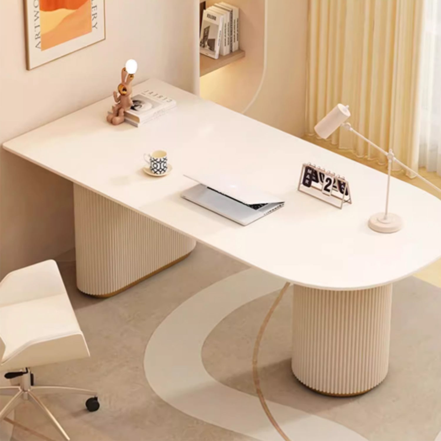 Featuring a half stadium table top crafted from highly resilient sintered stone, our DULLY work desk is supported by sturdy iron legs encased in a white tambour finish. This office desk offers a durable workspace while ensuring style is not compromised. Complete the Japandi look with our LYLA swivel chair.