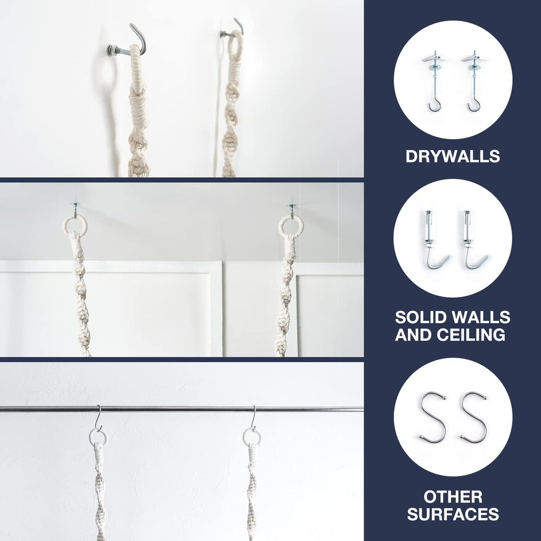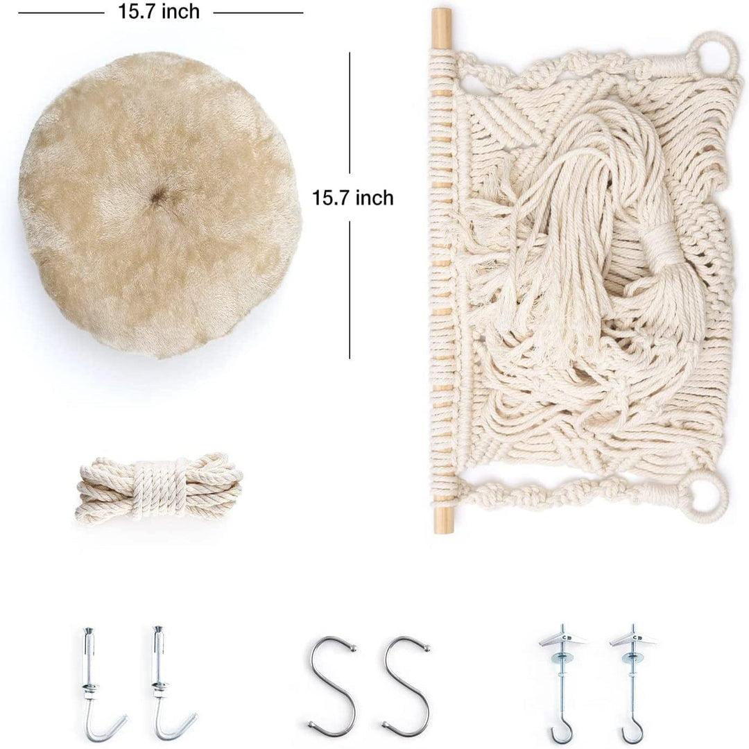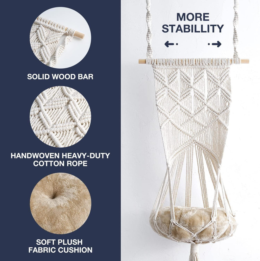 Macrame cat swing made of handwoven heavy-duty cotton rope and 2cm-dia hard solid beech wood stick, Very safe and sturdy. Finished with braided "O" ring loops at top of the hammock for hanging, it's the perfect addition to your living room or patio.