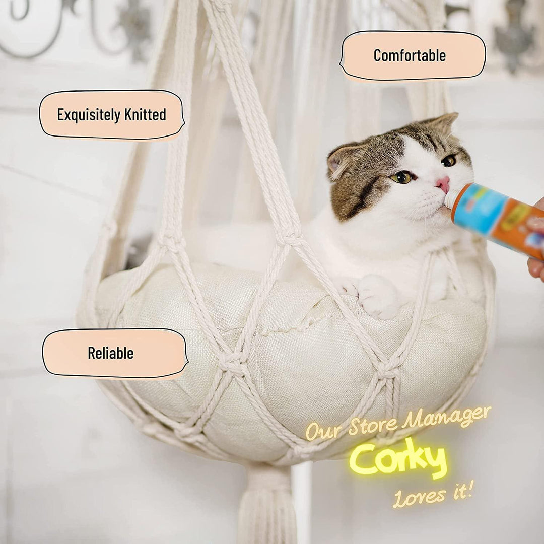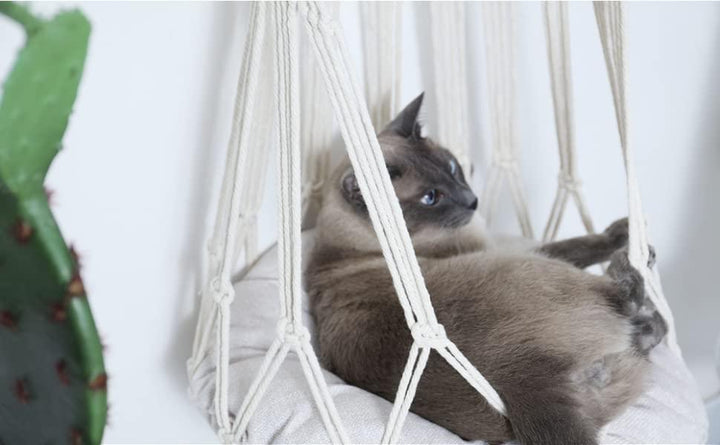 Presenthem macrame hanging cat bed with catnip filled is a seamless addition to any room’s décor! Thanks to its round shape bed, It is ideal for pets who love to curl up! This macrame lounger is leaving your cat in an island mindset.