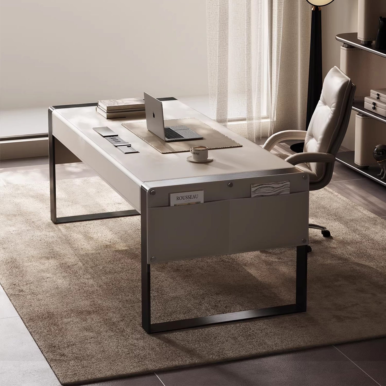 Enhance your study space with the FOUDA Modern Saddle Leather Study Table. Crafted from premium saddle leather, ash wood, and sturdy steel legs, this table combines durability with a contemporary design.