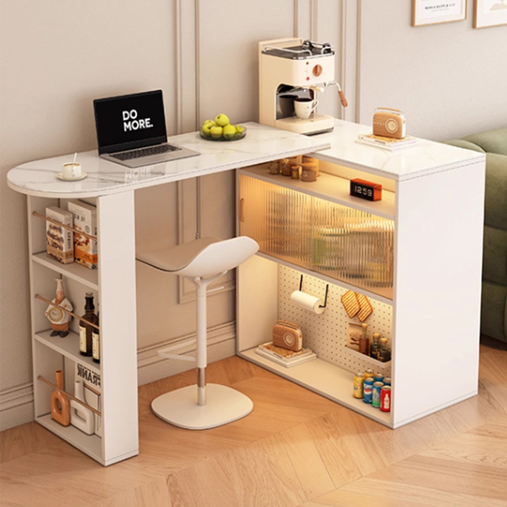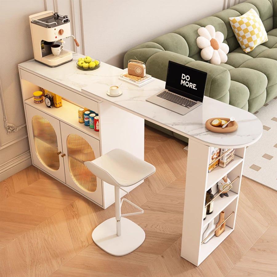 Create a cozy and inviting atmosphere with our VAYAN bar table, inspired by Hygge and Aesop styles. Featuring a rounded table corner on one end and a cabinet leg with shelves and doors, this table offers ample storage and display space. Its versatilem design allows it to be easily shifted into an L-shape, perfect for small spaces or corner areas. The in-built LED light adds a warm ambiance, making this table ideal for socializing and relaxation in any home or entertainment space.