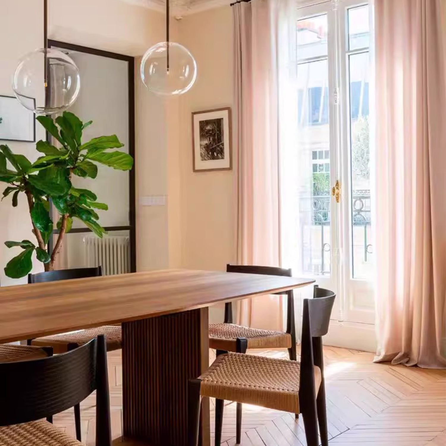 Make a statement with our COLMAN dining table. This grandiose design provides an extensive area for intimate dinners and large social gatherings. Crafted from solid pine wood, the table top is held securely by two fluted panel pillars, giving the impression of delicate balance. Complete the look with our BONE rattan dining chairs for a contemporary vibe.