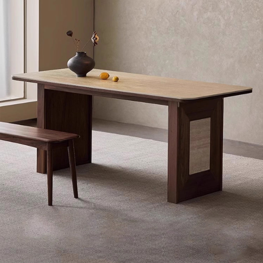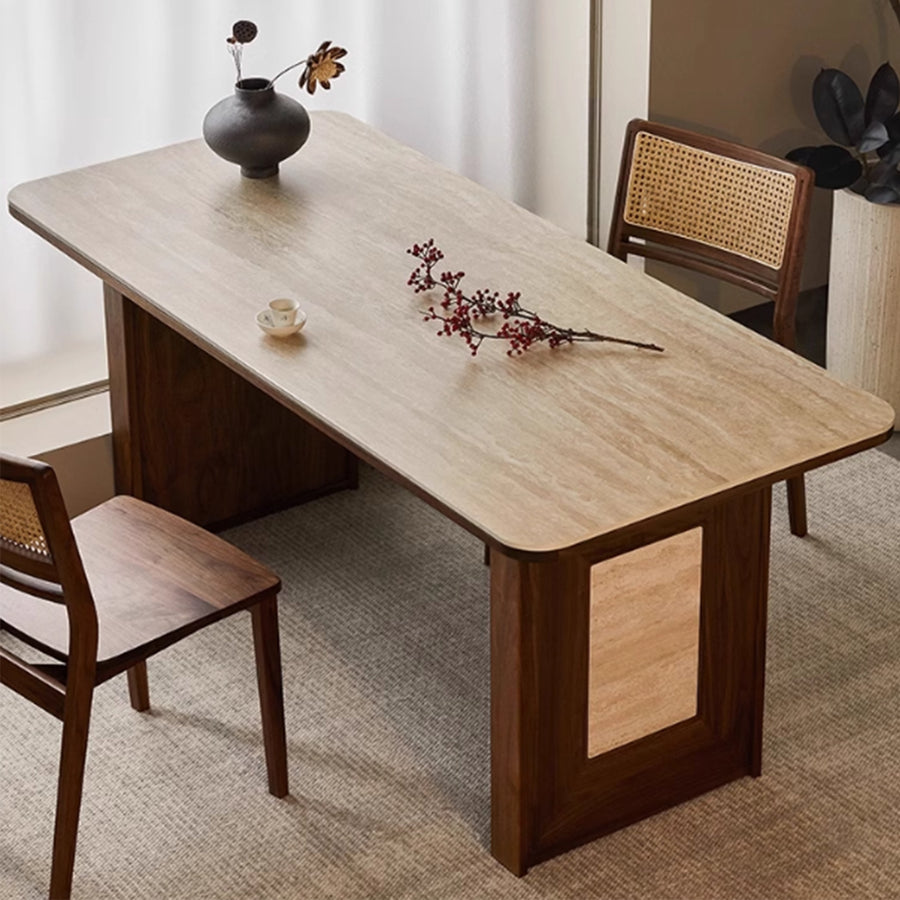 Our KHAIRY dining table is crafted from North American walnut wood, promising longevity and premium performance. Complete with the durability of sintered stone in a travertine finish, this table for resists wear and tear while maintaining a refined look. Its warm hues of wood and stone makes it a perfect choice for Aesop and rustic set ups.