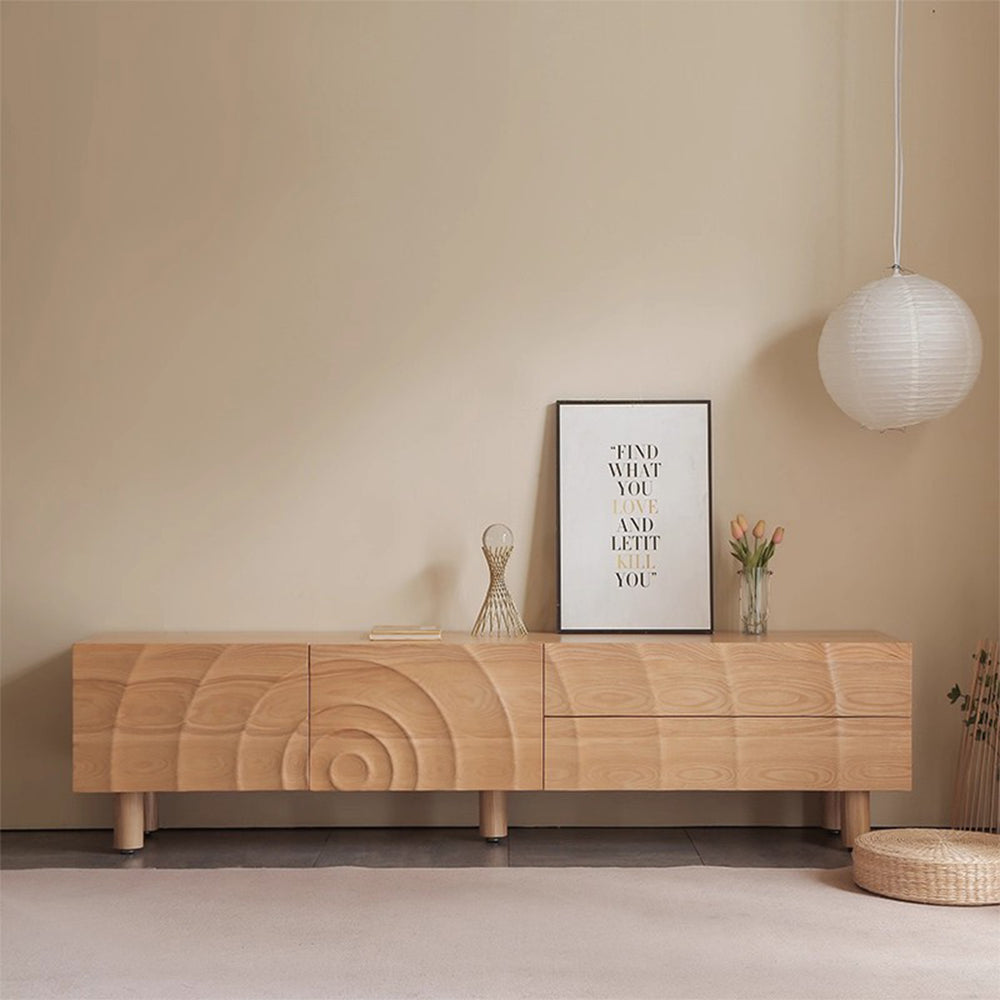 Revitalize your living room with our FLETAS TV cabinet, expertly crafted from FAS grade ash wood for durability and timeless appeal. Featuring a distinctive carved wave design, this entertainment unit showcases natural texture with modern minimalism. The spacious interior provides ample storage for media devices, cables, and decor, keeping your space organized. Whether used as a media stand or a statement television cabinet, its clean lines and elevated legs add class to any space. Perfect for modern, Scandinavian, or Japandi interiors, this TV bench is artfully designed.