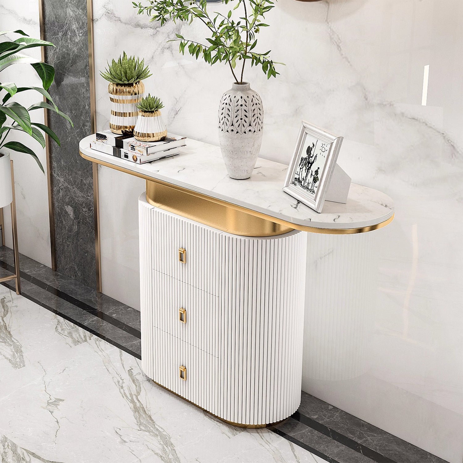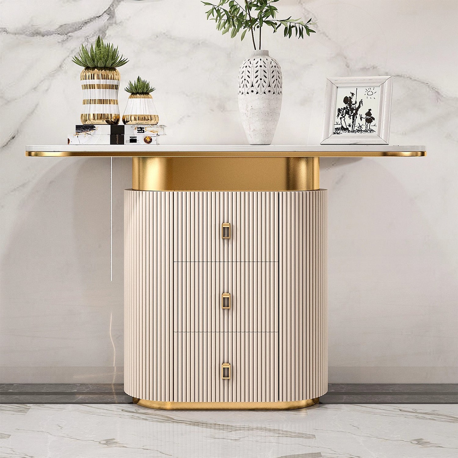 Perfect for luxurious homes, our DAPHNR console table combines classic Victorian curves with Hollywood's signature glamour. The sintered stone top and stainless steel frame create a striking contrast, while the tamboured leg drawers provide ample storage. Perfect for placement in the entryway or office lobby, this multifunctional table offers both a storage solution and spacious surface area for placement of your frames and accessories.