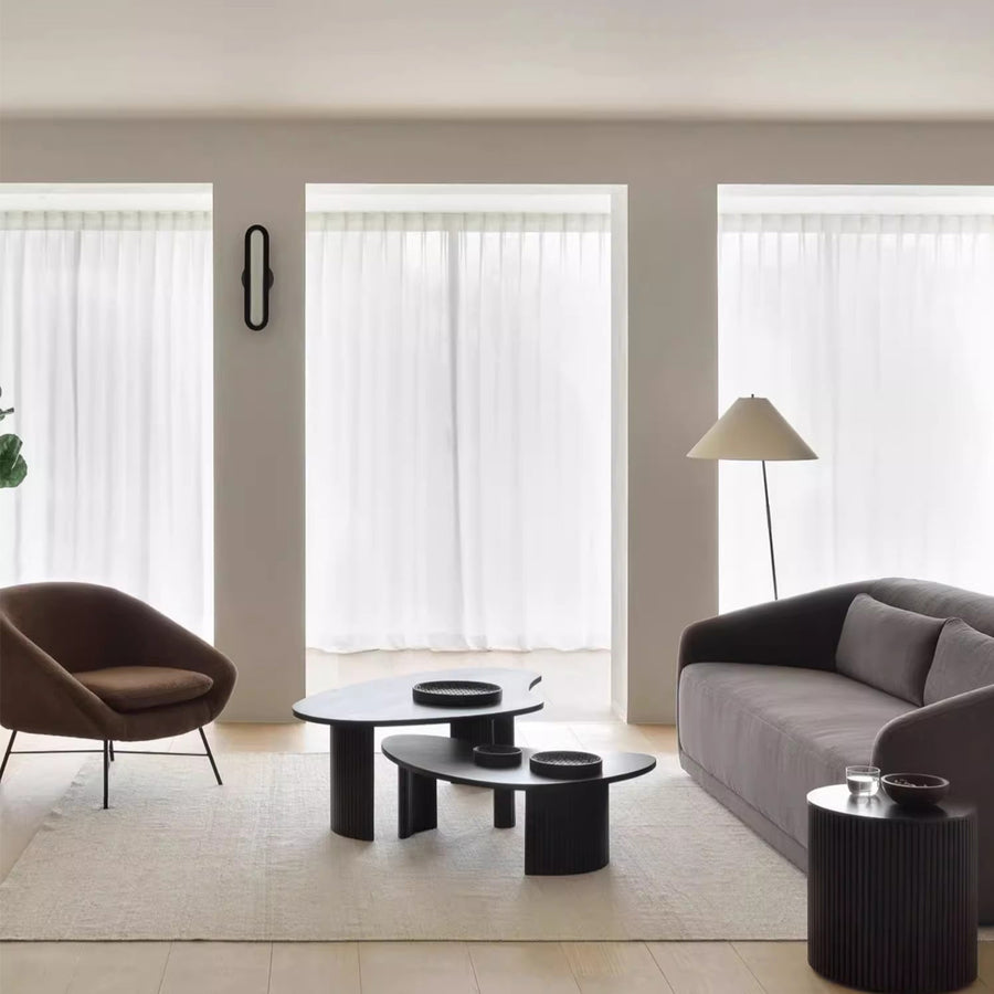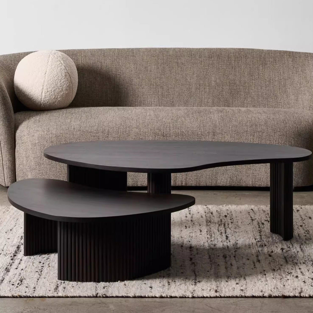 Designed to elevate your social gatherings, our VERVE nesting coffee tables feature an irregular shaped table top imitating water droplets or moving clouds. These tables can be easily pulled apart, offering separate surfaces for leisure or work. Crafted entirely from high-quality pine wood, they feature a sleek matte black finish that adds a smooth texture to your space. A striking centerpiece with its unique shape, this coffee table adds a touch of artistic flair to any minimalist, contemporary, and noir interiors.