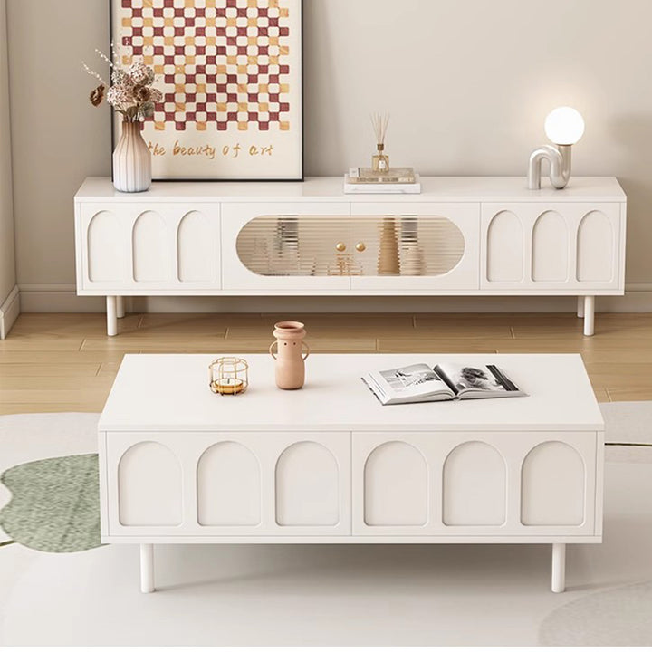 Soften the linear interiors of your home with our ESKI TV cabinet, featuring an arch motif and curved center panel doors. Pair the TV stand with our coffee table in the same style, and complete the look with our ZEG geometric rug for a play on shape and texture. An anchor furniture piece in any Japandi or minimalist space.