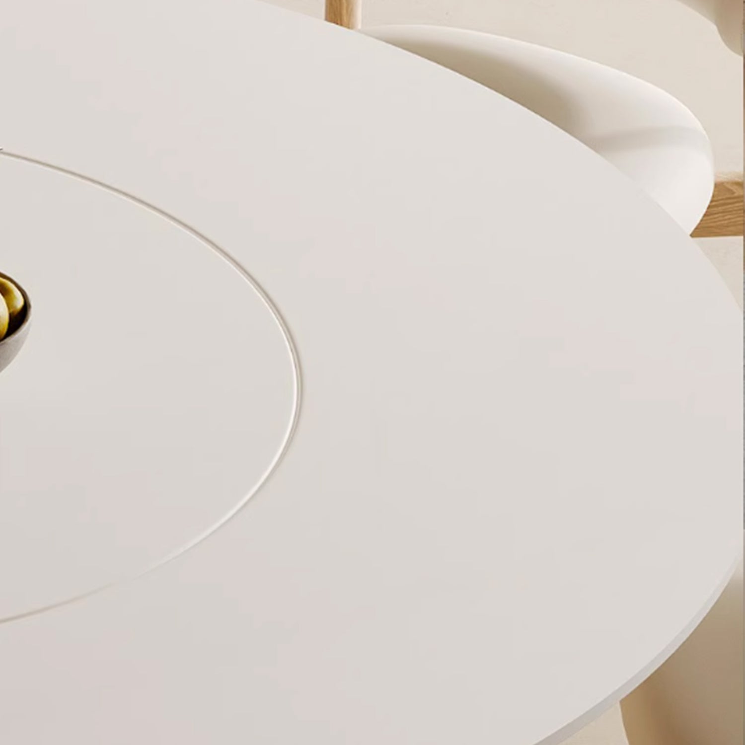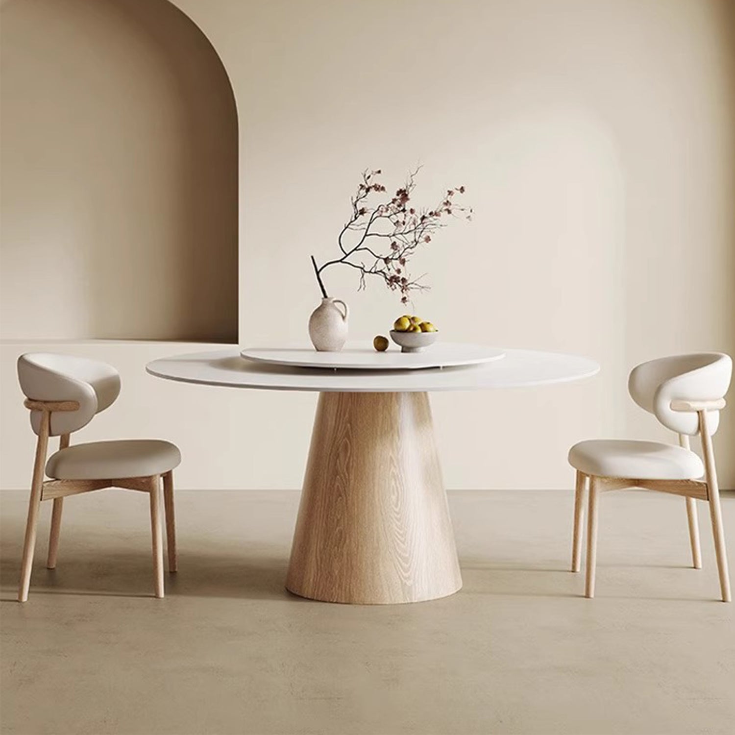 Gather around the warmth and simplicity of our Japandi-style round dining table, featuring a matte white sintered stone top and conical pine wood legs in a rich cherry wood finish. The unique blend of materials and minimalist design creates a cozy and inviting atmosphere. Choose from an optional lazy susan inlay for added functionality. Perfect for wabi sabi, hygge, or Scandinavian-inspired interiors, this table brings people together with its warm and welcoming presence. The sintered stone top ensures durability, while the cherry wood finish adds a touch of sophistication to any dining space.