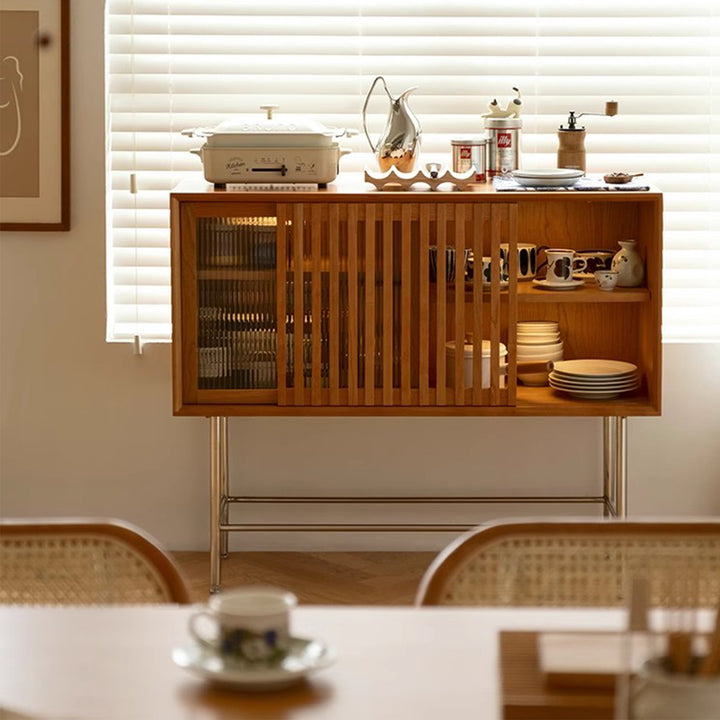 Enhance your living or dining room with our Wood Storage Sideboard Buffet. Featuring a glass door and a rustic fencing design, it offers both farmhouse style and additional storage. The functional sliding doors roll smoothly on a sturdy track, perfect for storing kitchenware or more. Crafted from solid pinewood with a weathered finish for a retro charm, it's supported by a stable metal frame.