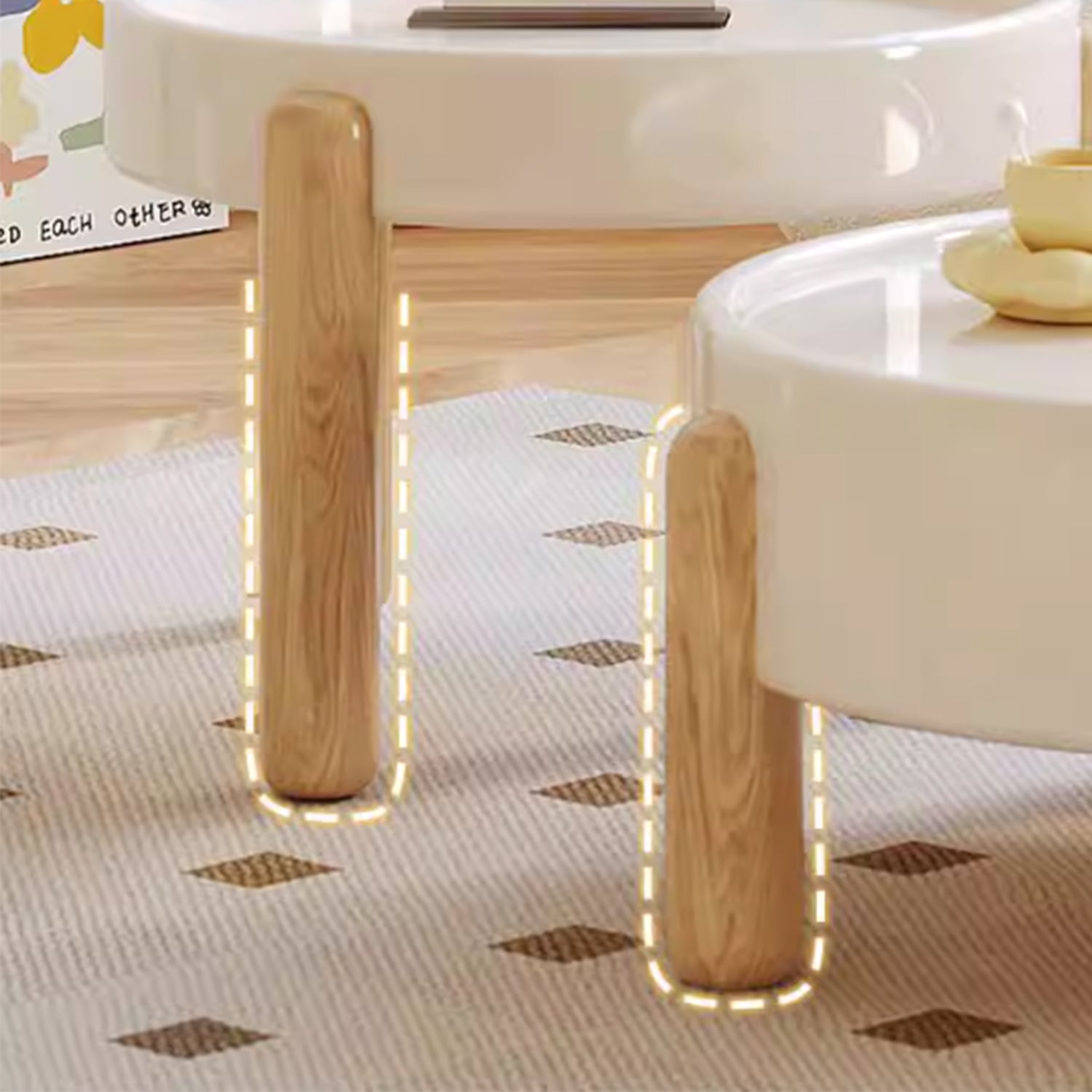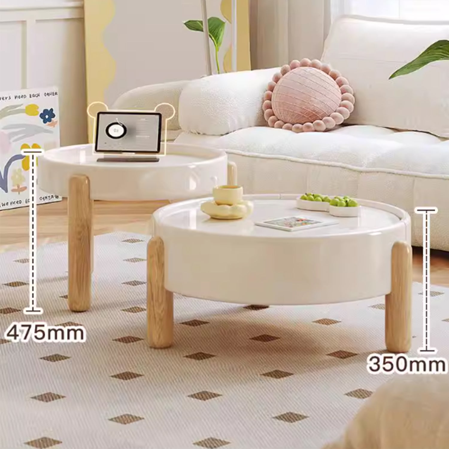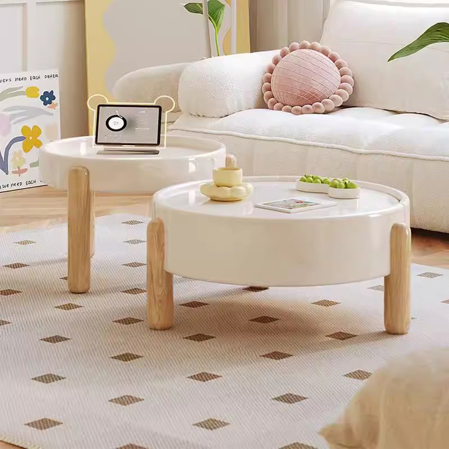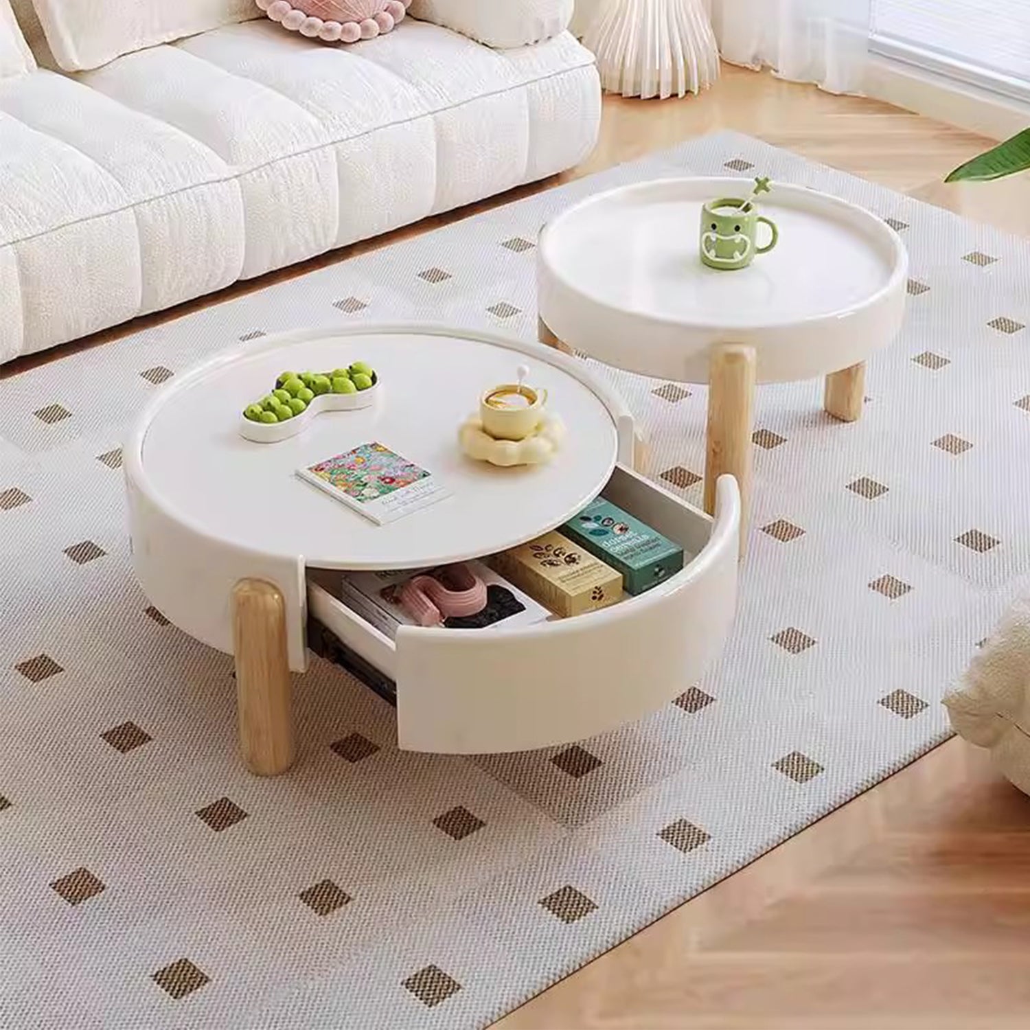 Embrace the simplicity of Japandi style with our TALOR coffee table, expertly crafted to bring warmth and serenity to your living room. The milky white finish adds a soft, calming touch, while the pine wood legs in light oak finish provide a natural and sturdy base. The center table features a deep drawer, perfect for storing books, magazines, or remotes, keeping your space organized and clutter-free. The round shape and minimal design make this coffee table perfect for homes with children and fur kids. Its understated beauty and functional design make it a perfect addition to your Japandi-inspired home.