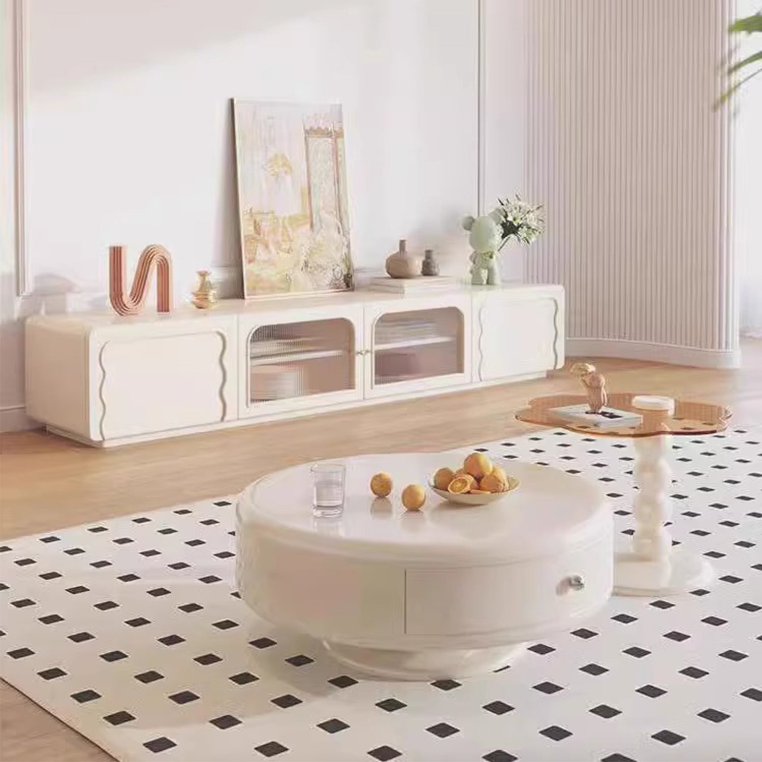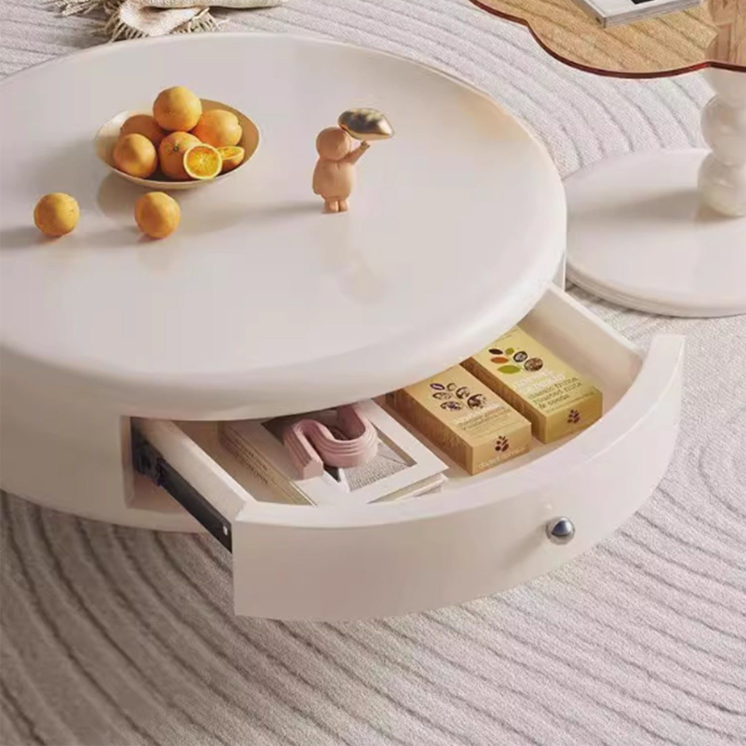 Complete your Japandi-inspired living room with our NISSA round coffee table and matching flower-shaped side table. The coffee table features a milky white finish, a deep drawer for storage, and a sleek swivel base for effortless movement. Pair it with the charming side table, boasting an amber-tinted glass top in a beautiful flower shape. The combination creates a harmonious and inviting atmosphere, perfect for cozy gatherings or everyday relaxation. The Japandi style's emphasis on minimalism and natural beauty shines through in this pairing, bringing a sense of serenity and warmth to any Hygge or Wabi Sabi inspired homes.