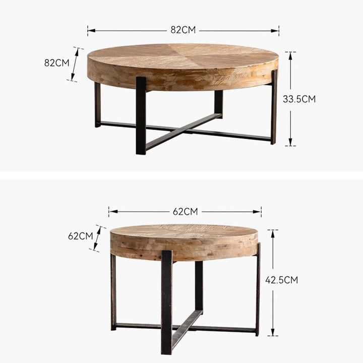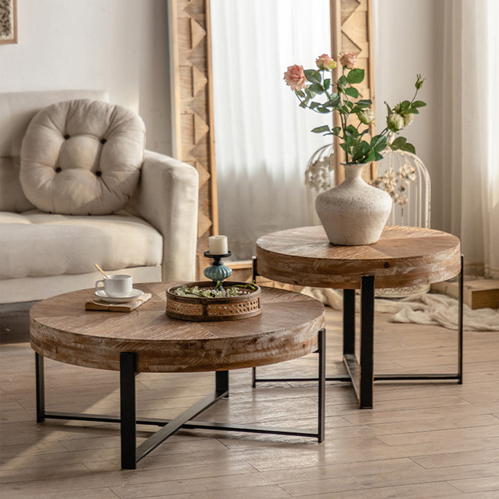 Elevate your seating area with our rustic farmhouse coffee table, a perfect complement to your sofa or couch. This round coffee table boasts a thick tabletop adorned with Oak Veneer over MDF, providing an elegant surface for displaying everything from remotes and coasters to appetizer trays and beverages.