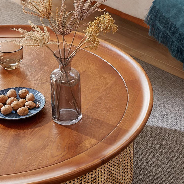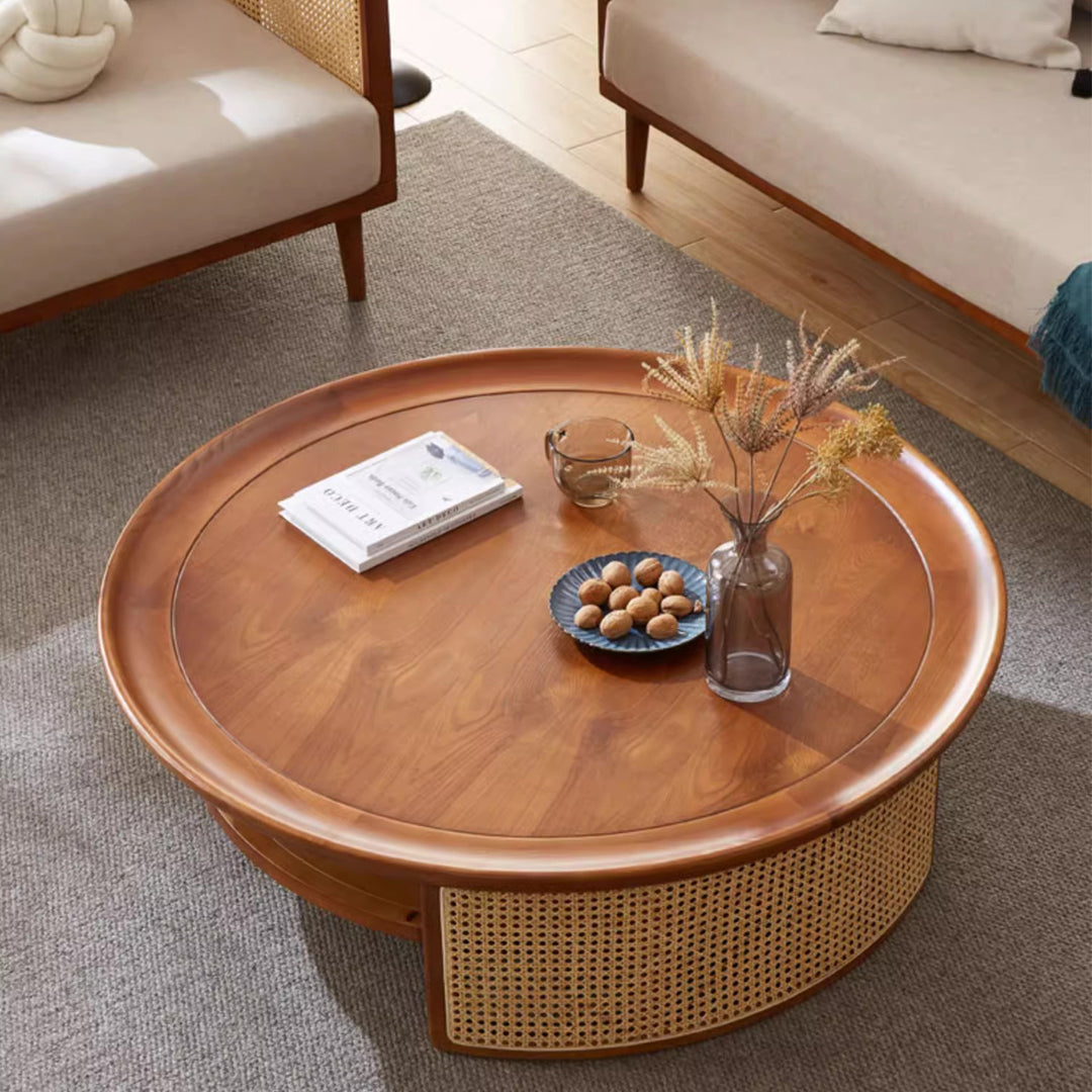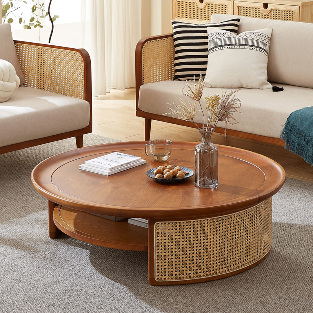 Elevate your living space with our low, round coffee table crafted from high-quality ash wood. This durable piece features ample storage, a sturdy tabletop, and a protective fence, preventing items from falling. Its sleek, modern design effortlessly complements any home decor style.
