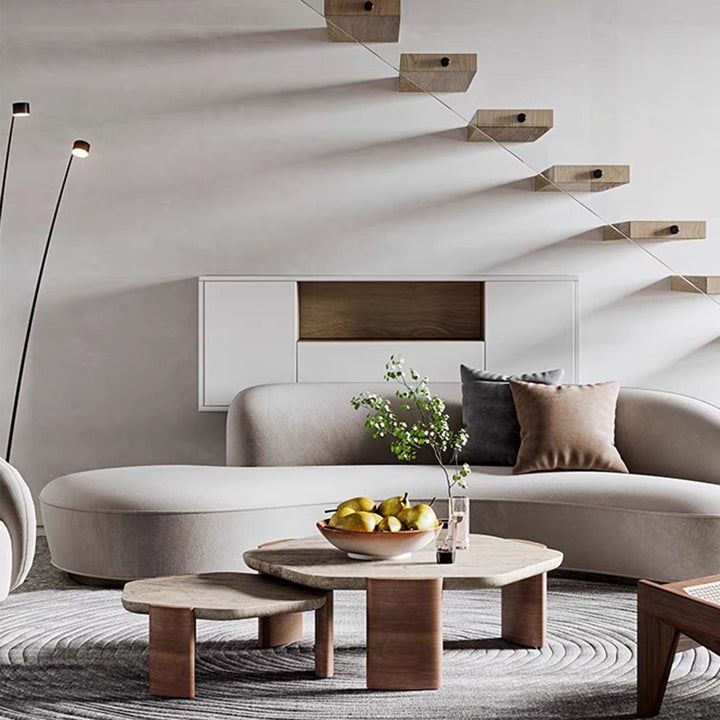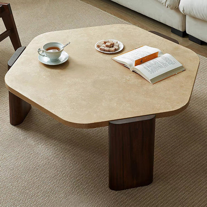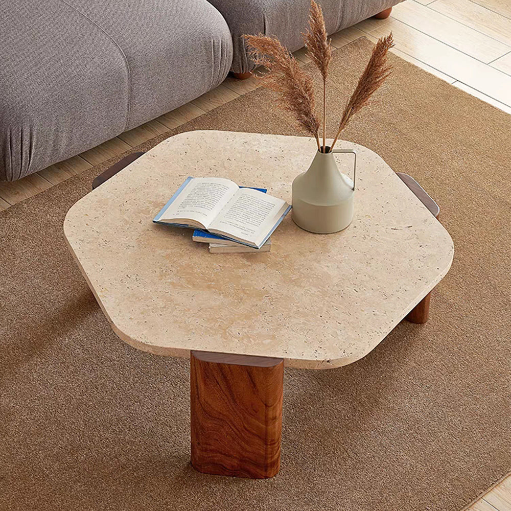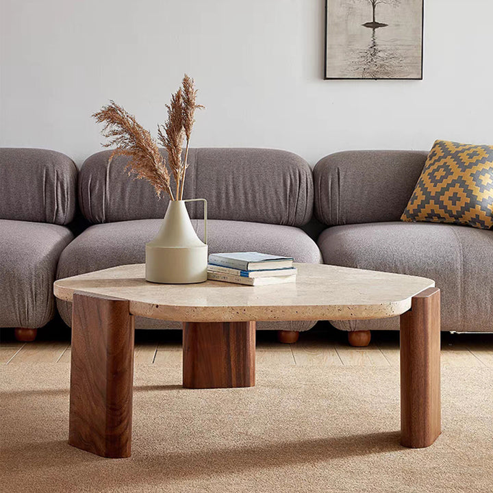 Introducing our stunning round coffee table crafted from luxurious travertine. Its low-profile design is perfect for gatherings, creating an inviting atmosphere. The combination of the travertine tabletop and sleek black walnut open-frame legs gives it a light and airy appearance, making it an excellent choice for cozier spaces. The legs converge at the table's center, ensuring stability while leaving plenty of room for comfortable seating arrangements.
