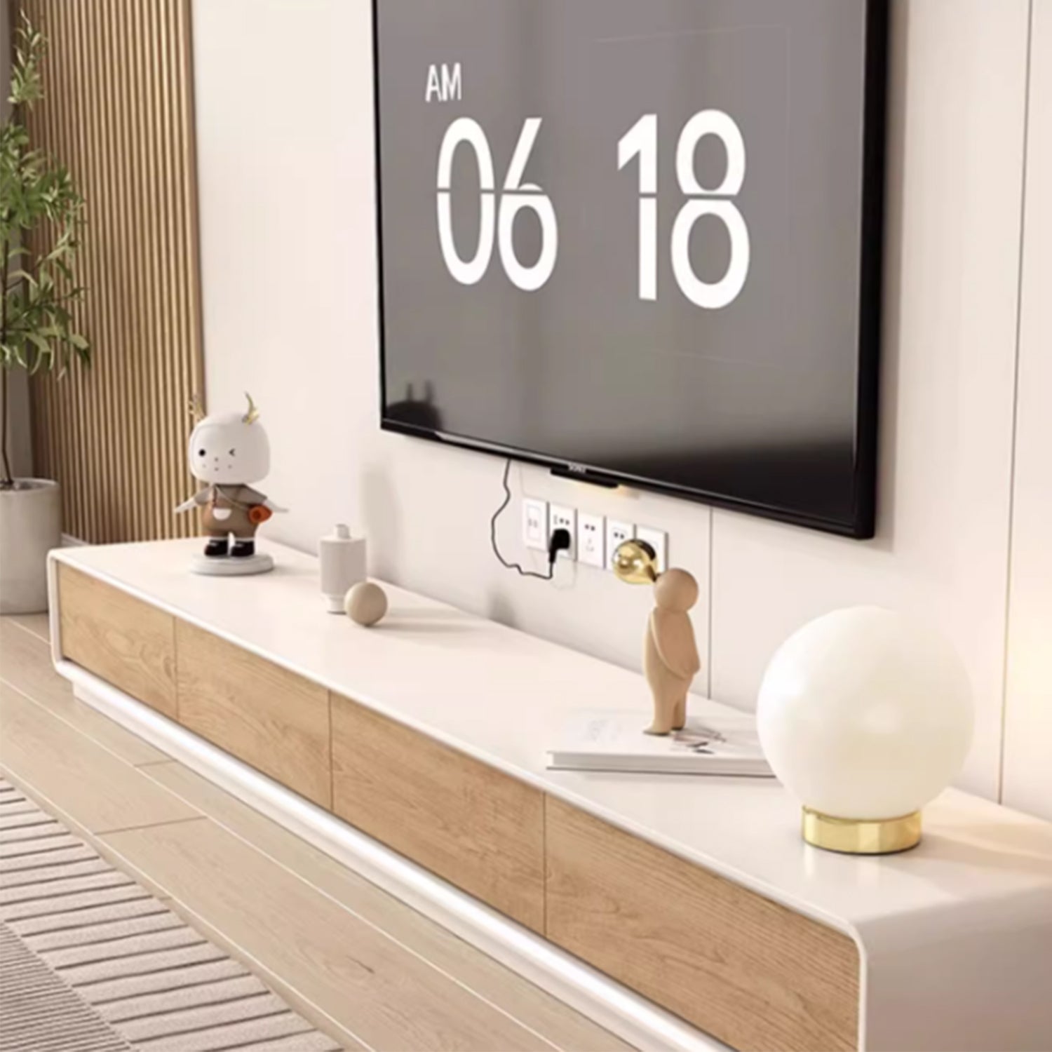 Revamp your space with our ABSIN modern TV cabinet & coffee table. Made from durable fiberboard in a beautiful oak finish, this living room set seamlessly complements contemporary, minimalist, Japandi, Scandinavian, and Wabi Sabi interiors. Featuring drawers running along its entire length, this console provides spacious storage for your media accessories and more. Its warm palette adds a calming touch to your living space.
