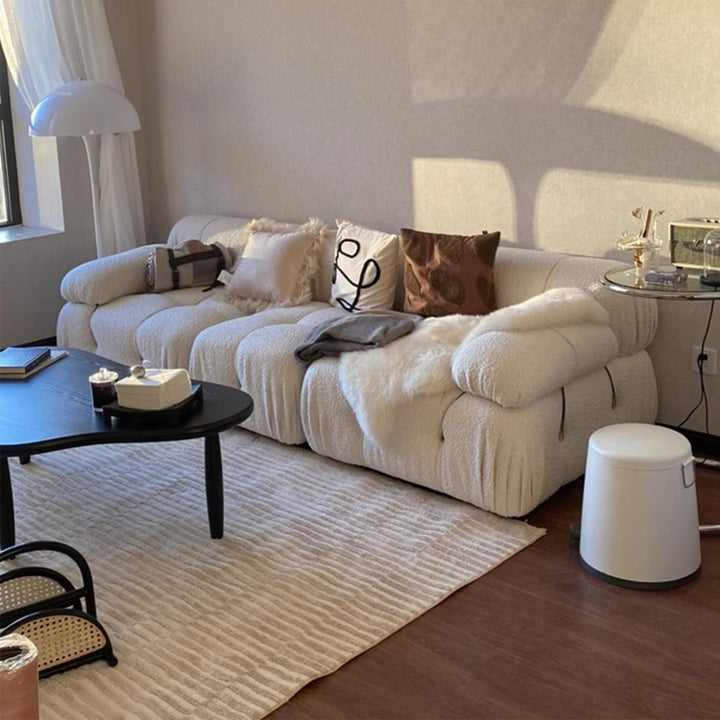 Indulge in profound comfort with our Masdio Modern sofa, meticulously crafted with a durable pine wood interior structure, high-density foam infill, and adorned in sumptuous boucle fabric. This understated yet sophisticated sofa design showcases a cloud-like silhouette, accentuated by tufted seats and backrests for added charm. To achieve the perfect Japandi or minimalist aesthetic, complement this piece with our matching rattan floor lamp and a sleek low pile rug.