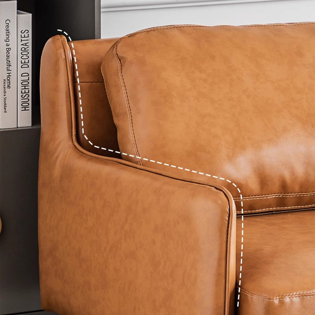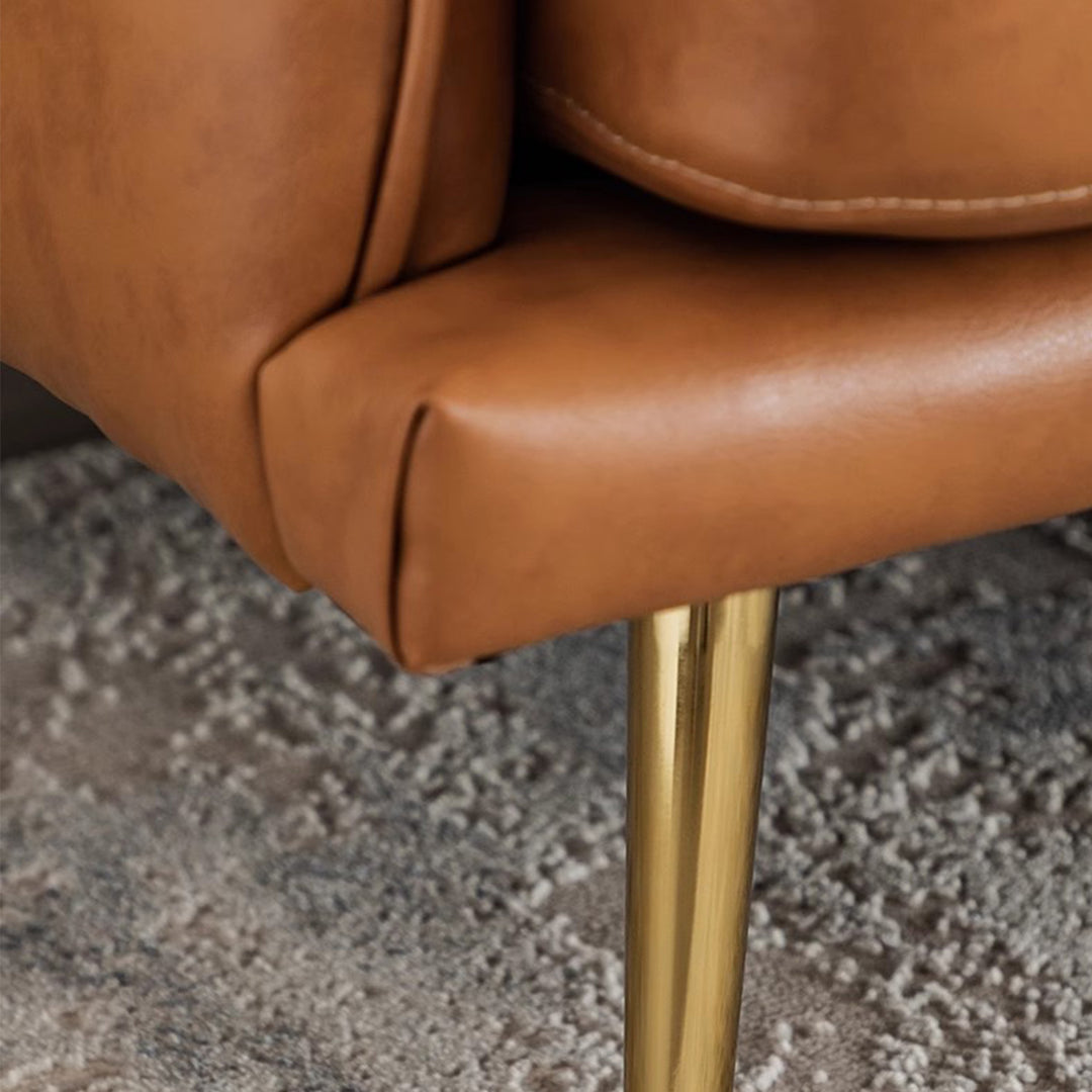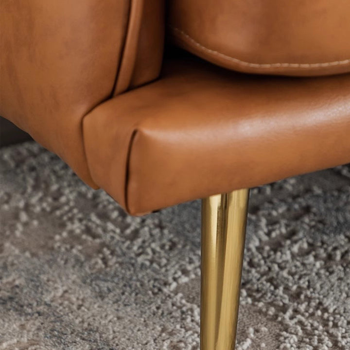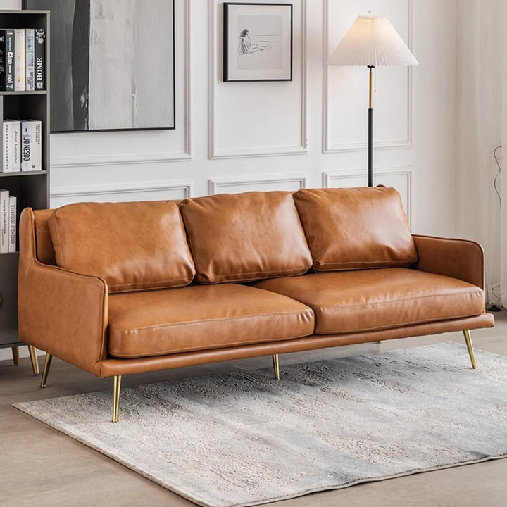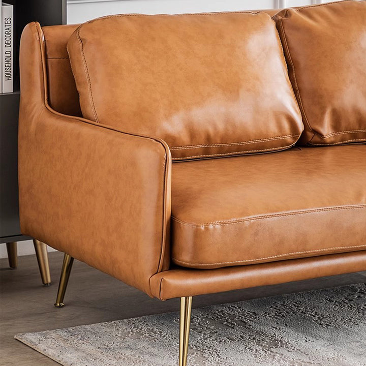 Crafted to elevate your living space or office lounge, our Masdio Modern Leather sofa boasts a mid-height backrest and slender gold legs. Atop this elegant foundation rests supple leather upholstery, exuding comfort and durability, ideal for both relaxation and professional settings. With its slim profile and contemporary structure, this sofa is destined to become an impeccable statement piece for your modern, rustic, or industrial-themed home or office.