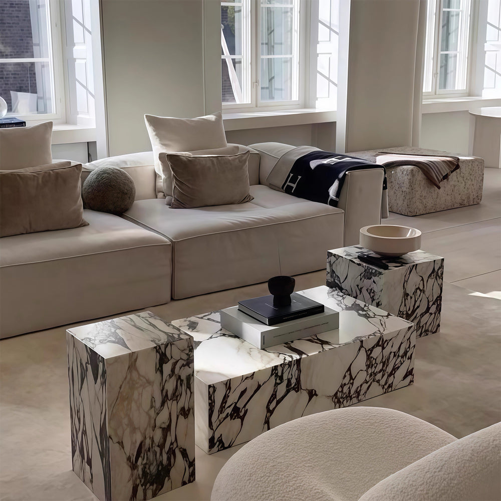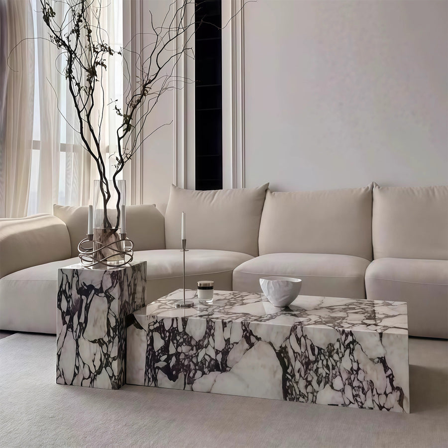 Enveloped in luxurious engineered marble, our MOONSTONE TV cabinet will anchor your living space in timeless class. Crafted from a solid wood structure and wrapped in a high gloss arabescato marble print, this coffee table is designed with functionality in mind while not compromising on style. Whether nestled in a contemporary setting or gracing a classic Victorian interior, this table will transform your home into a showroom, where modern aesthetics meet refined luxury. Make a bold statement and complete the look with our MOONSTONE TV console and ASHER floor rug.