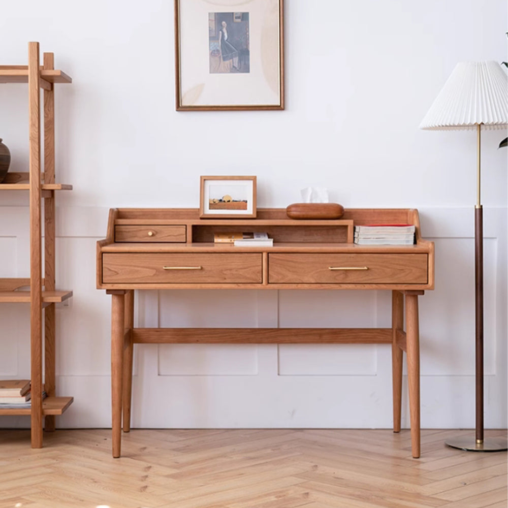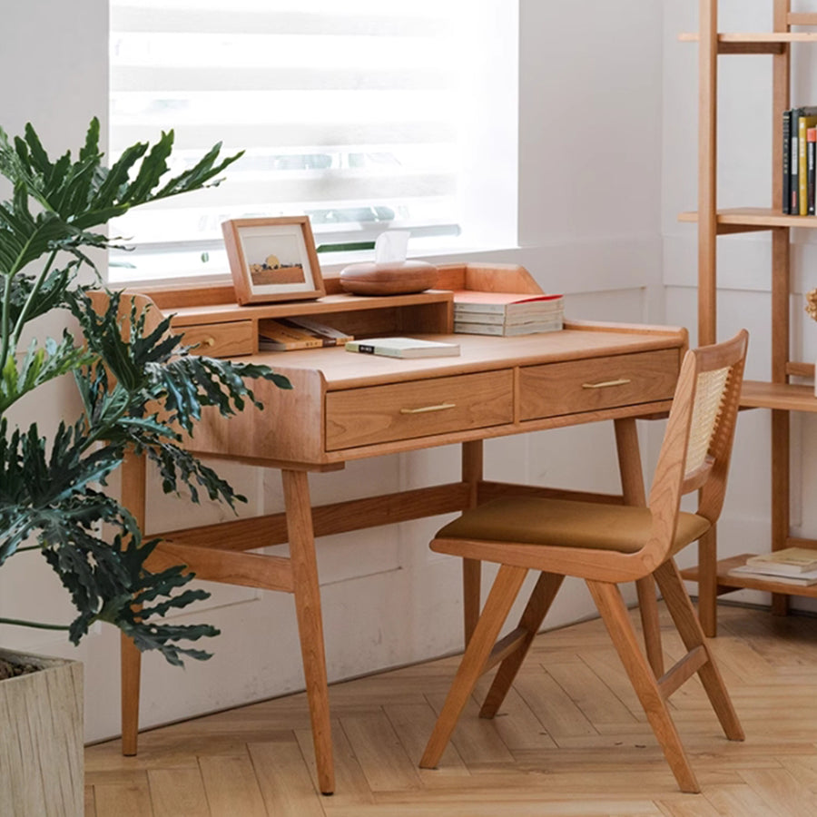 Upgrade your study corner or home office with our QUIS work desk. Crafted from high quality pine wood in a warm oak finish, this study table comes complete with an integrated hutch for your stationery and accessories. Two spacious drawers adorned with sleek gold handles offers room for storage of your files and work essentials. The beveled corners ensure safety for households with young children and pets. This timeless design will invite nature into your modern, japandi, or Scandinavian home.