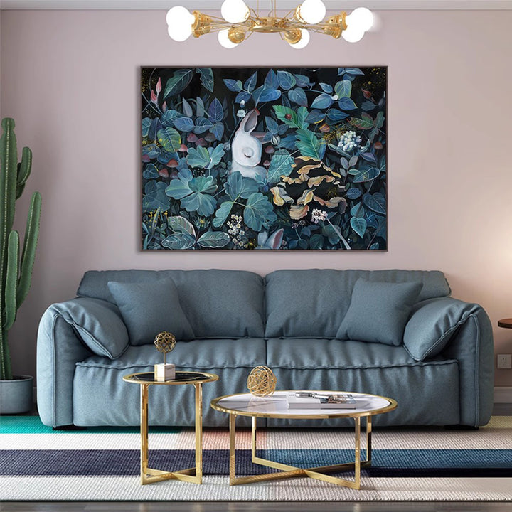 Elevate the charm of modern, contemporary, or hotel-inspired spaces with this enchanting wall art. Delicately portraying a sleepy bunny nestled amidst lush greenery, this piece infuses a sense of tranquility into your foyer, bedroom, or living room. For an added eclectic touch, pair it with our LOOP standing lamp and complete the look with a whimsical flair.