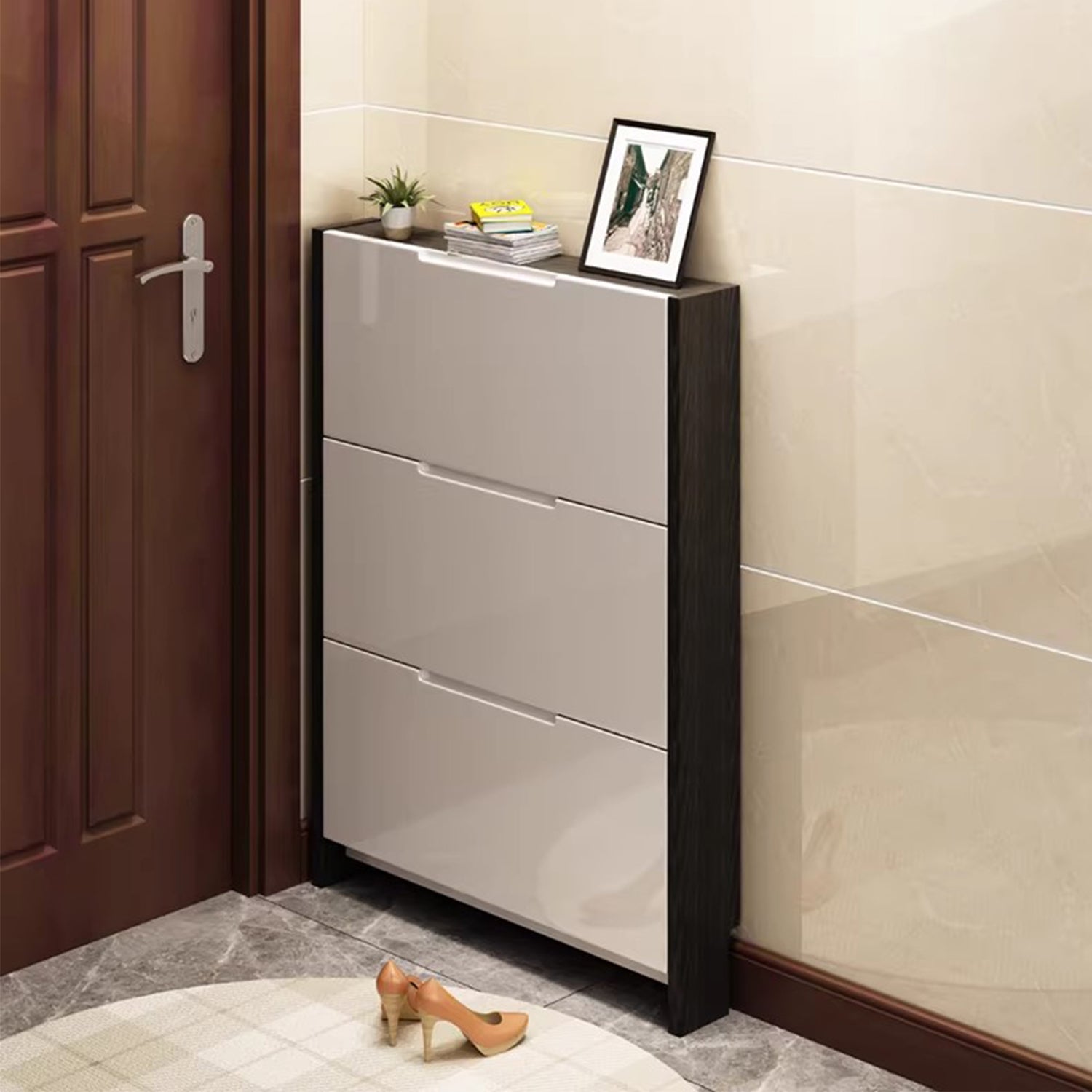 Upgrade your entryway with CHOMEL ultra slim shoe rack. Crafted from high-quality artificial board, this sleek cabinet combines functionality with contemporary style. Its clean lines and minimalist design offer a chic storage solution for your footwear, keeping your space organized and clutter-free. With ample storage space and a durable construction, it effortlessly complements any modern decor. Elevate your home's aesthetic while keeping your shoes neatly stowed away with this stylish and practical shoe cabinet.