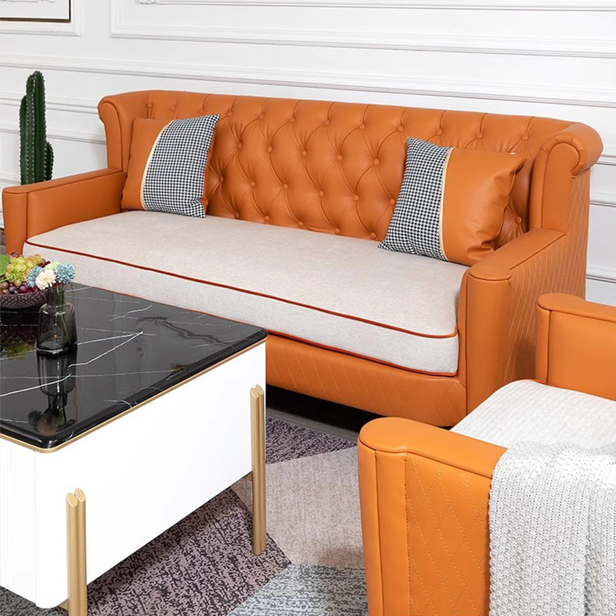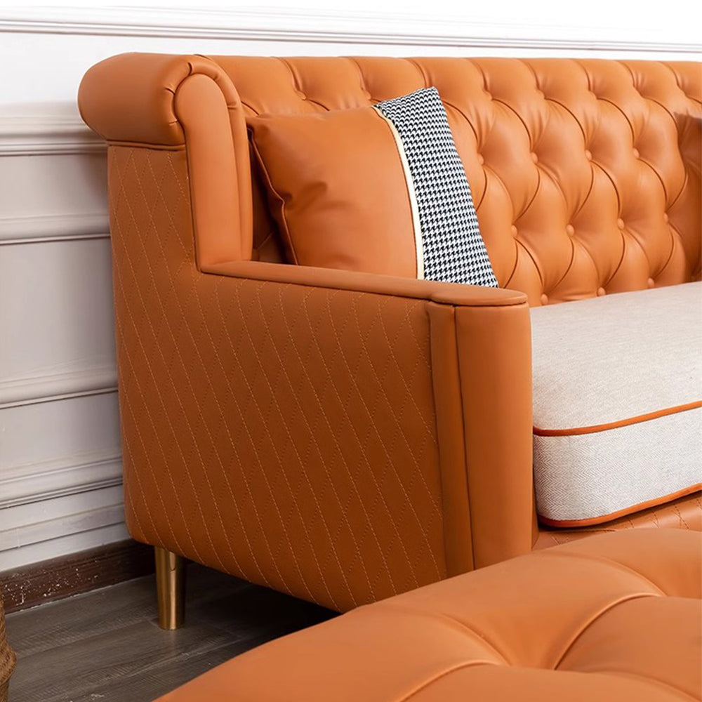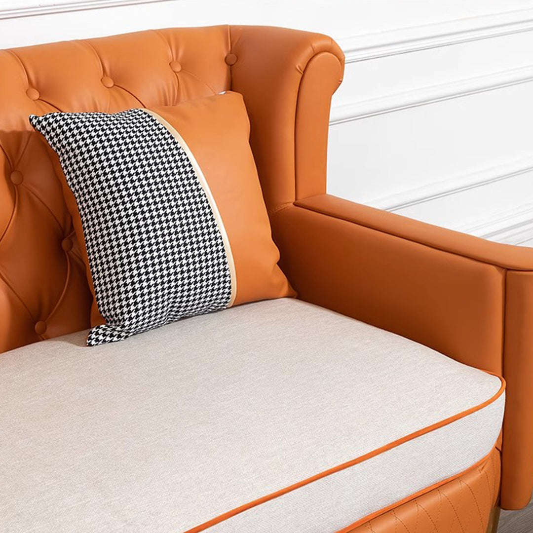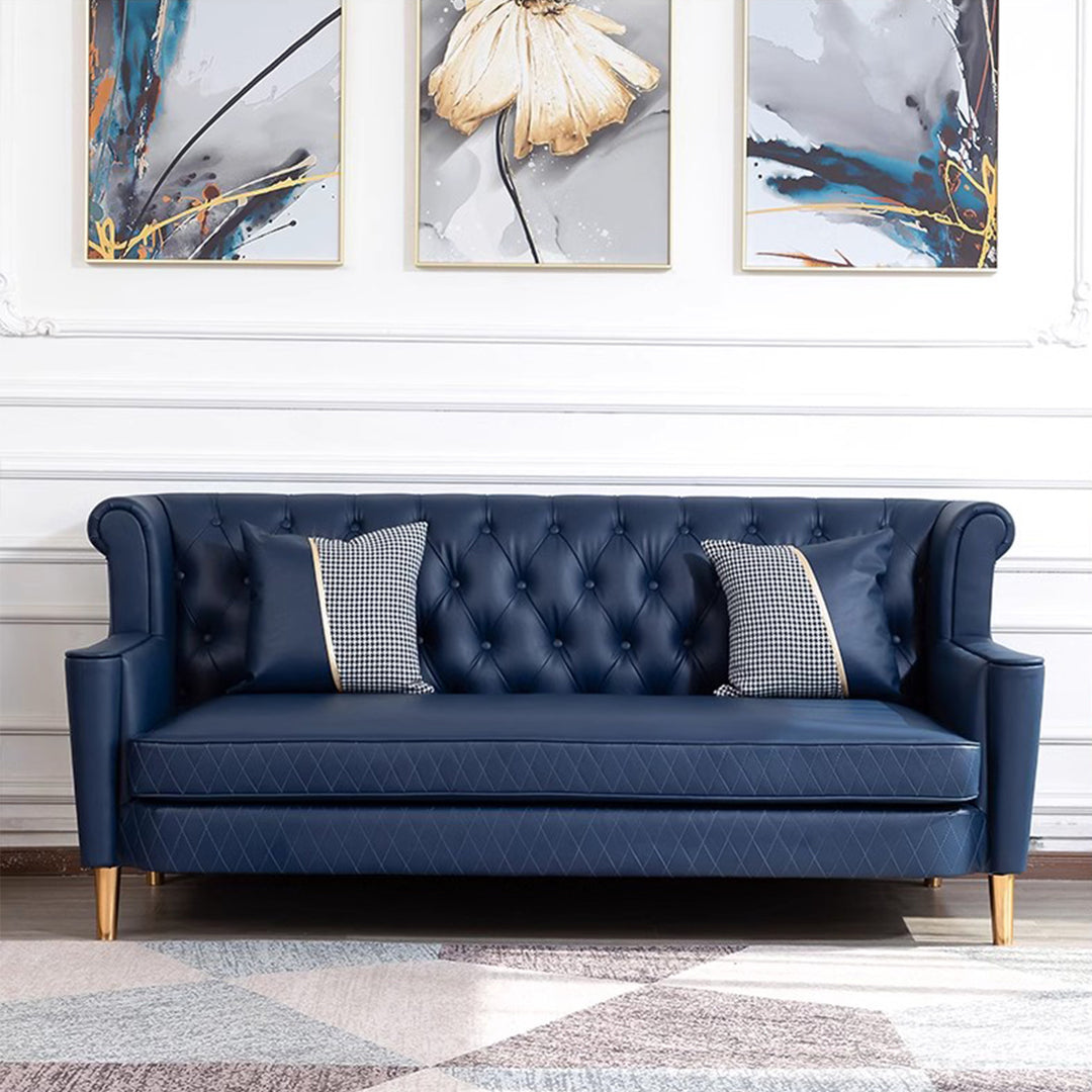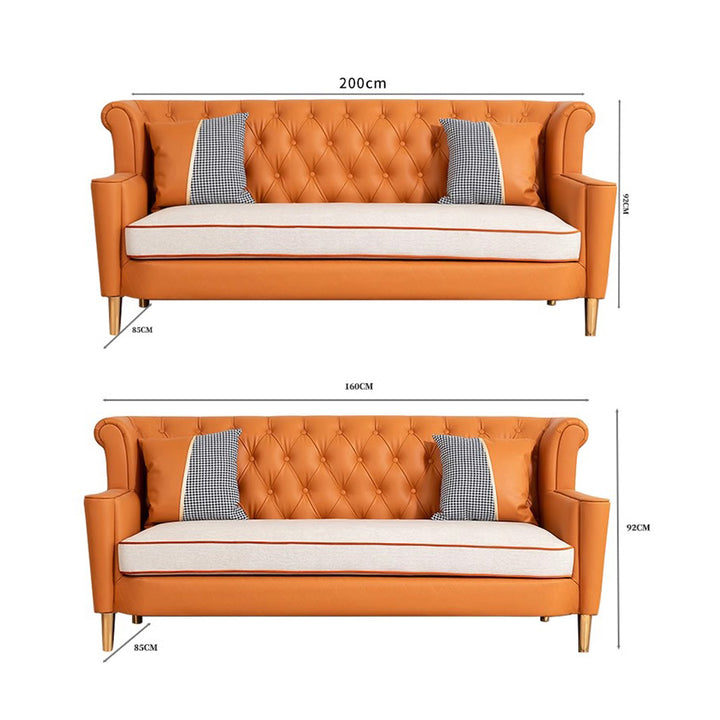 A contemporary twist on the classic Chesterfield, our Masdio Victorian Leather sofa showcases a winged backrest with elegant tufting and gold metal legs. Built with a sturdy pine wood frame and high-density foam cushioning, it maintains its shape and offers lasting comfort. The sophisticated faux leather upholstery enhances its refined appearance. Perfect as a statement piece in a classic or Edwardian-inspired living room or office lounge, the Masdio Victorian Leather sofa seamlessly blends traditional charm with modern elegance.