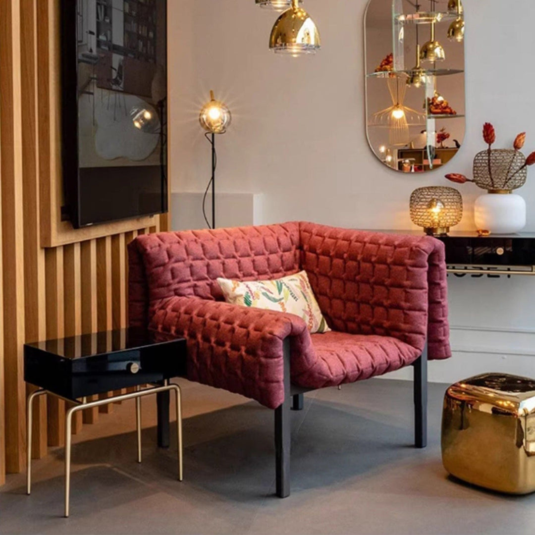 Showcasing a unique and captivating design, the Masdio Postmodern sofa features a robust pine wood frame paired with luxurious fabric upholstery. Its intricate quilt pattern adds a touch of elegance, making it a beautiful centerpiece or accent chair. Available in four colors, it effortlessly complements any lounge room or home office, providing both style and comfort.