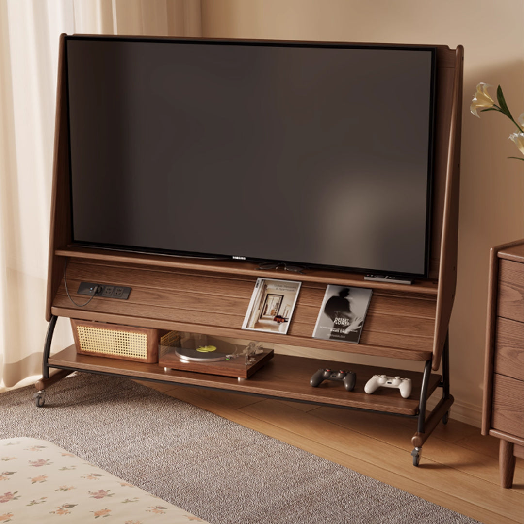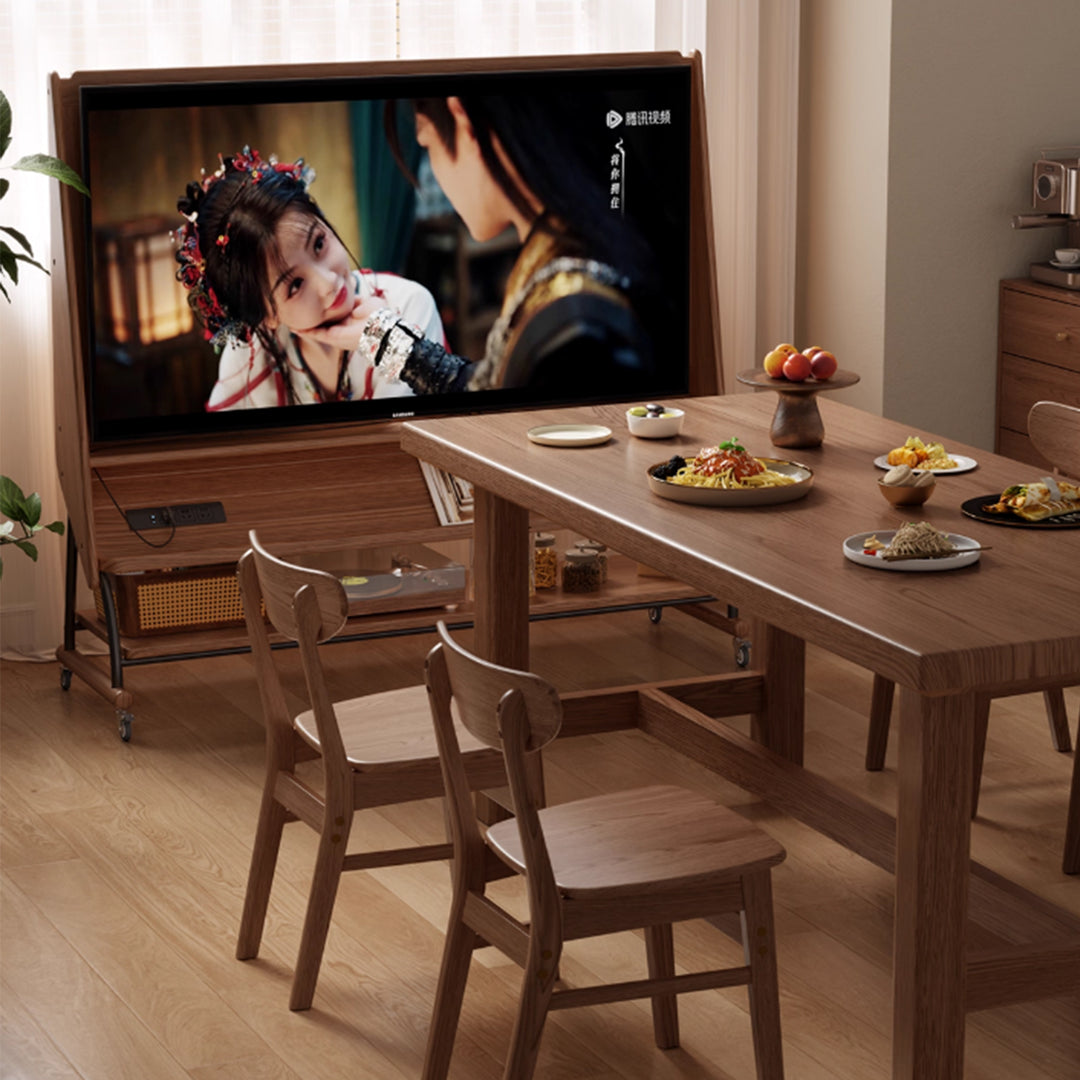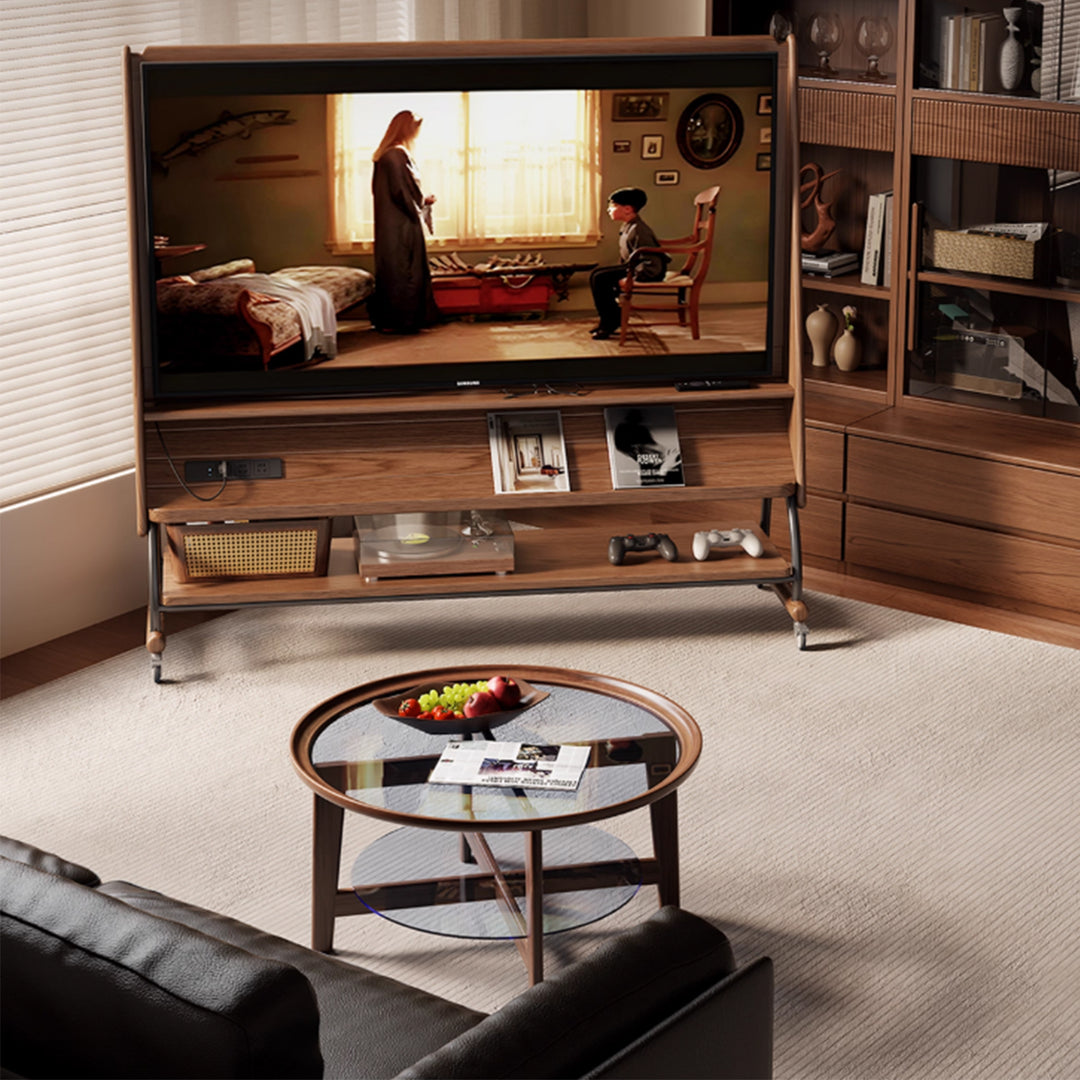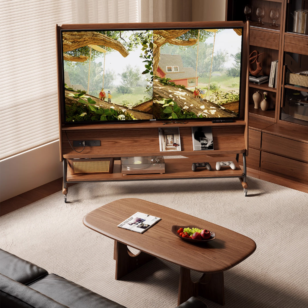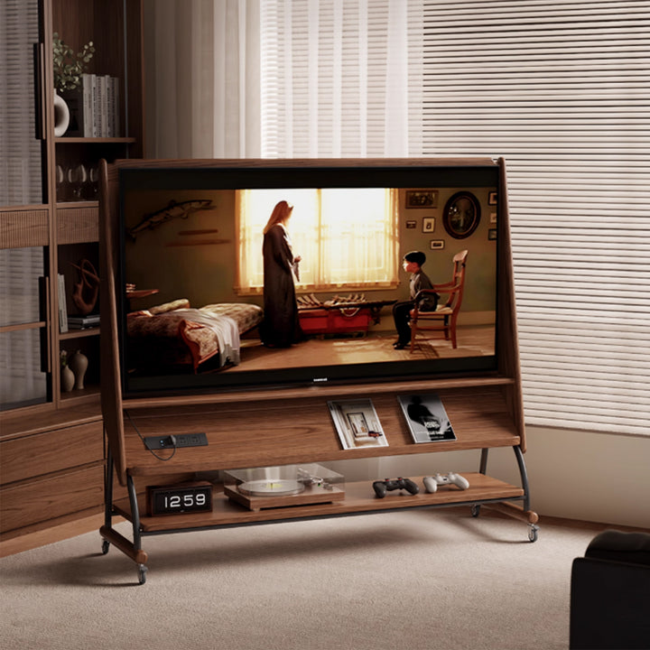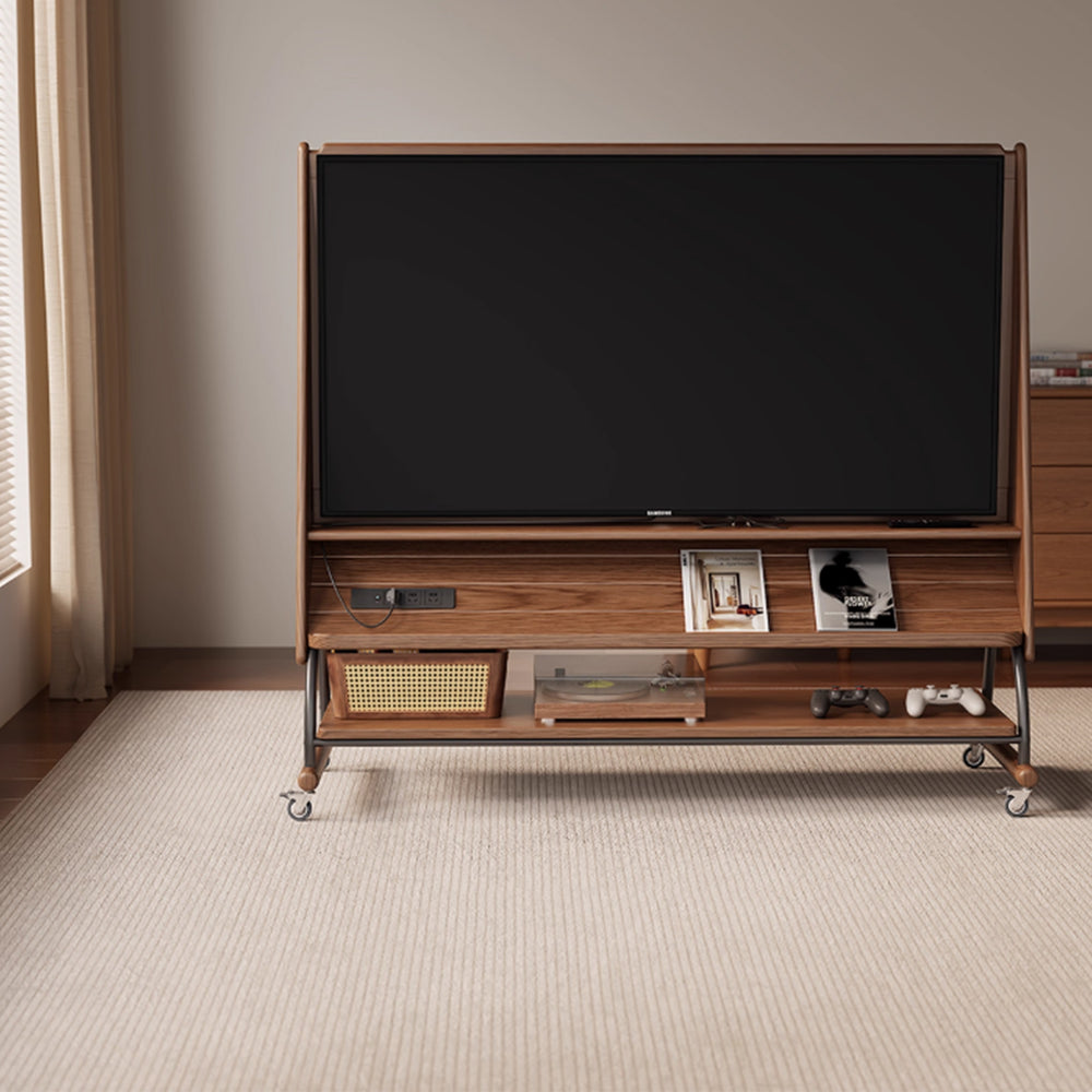 Add a touch of rustic sophistication to your living room with our GANBA feature wall TV console. Crafted from multilayer board, this sturdy piece boasts a rich, dark walnut finish and a Japandi-inspired design. The addition of wheels ensures effortless mobility, while the bottom shelves provide ample storage for media essentials and decorative items. Perfect for those who love the warmth of rustic charm combined with the minimalism of Japandi style, this TV console is a statement piece that elevates any room's aesthetic.